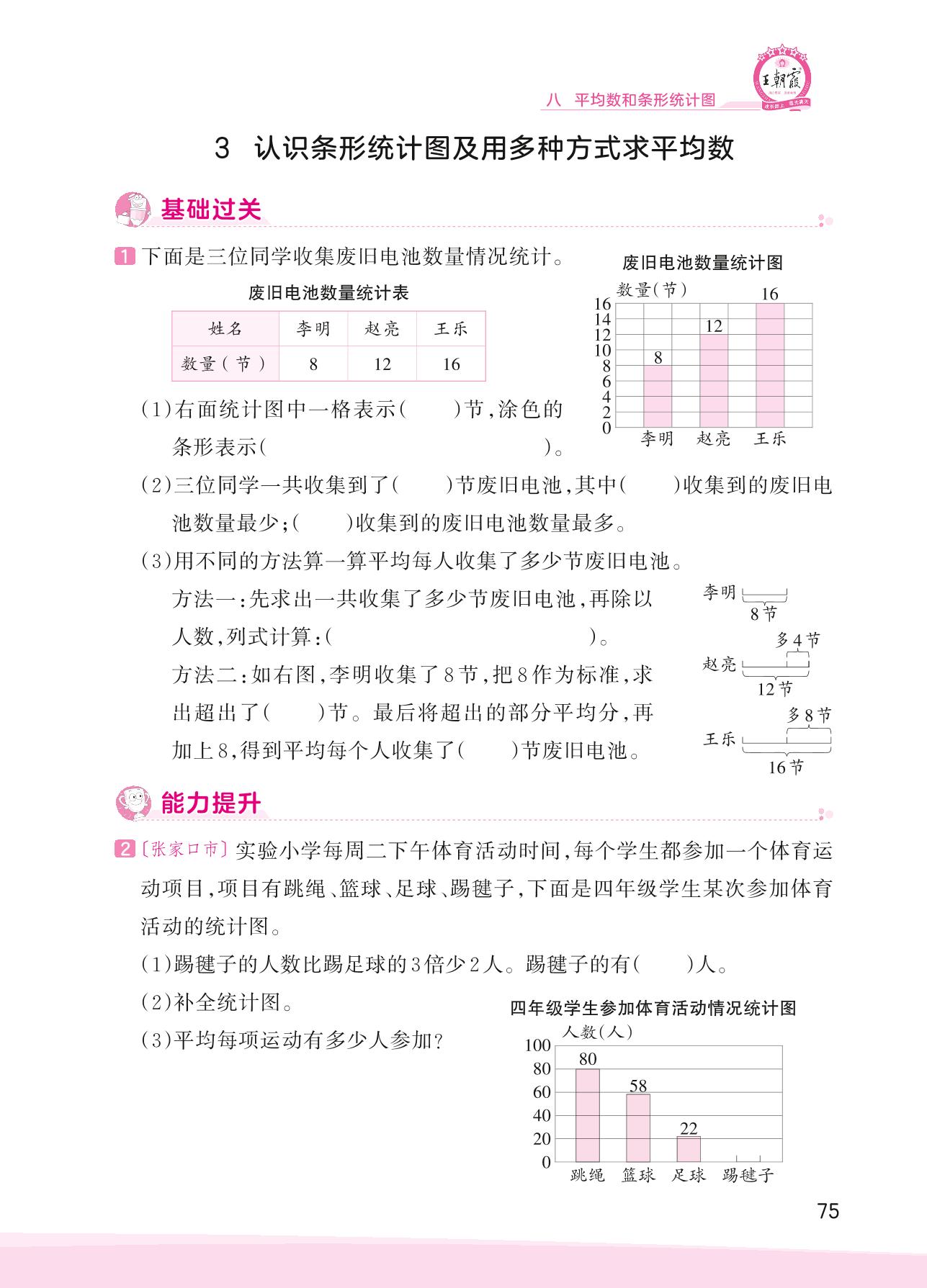 2023上册四年级数学冀教版 八 平均数和条形统计图——3 认识条形统计图及用多种方式求平均数