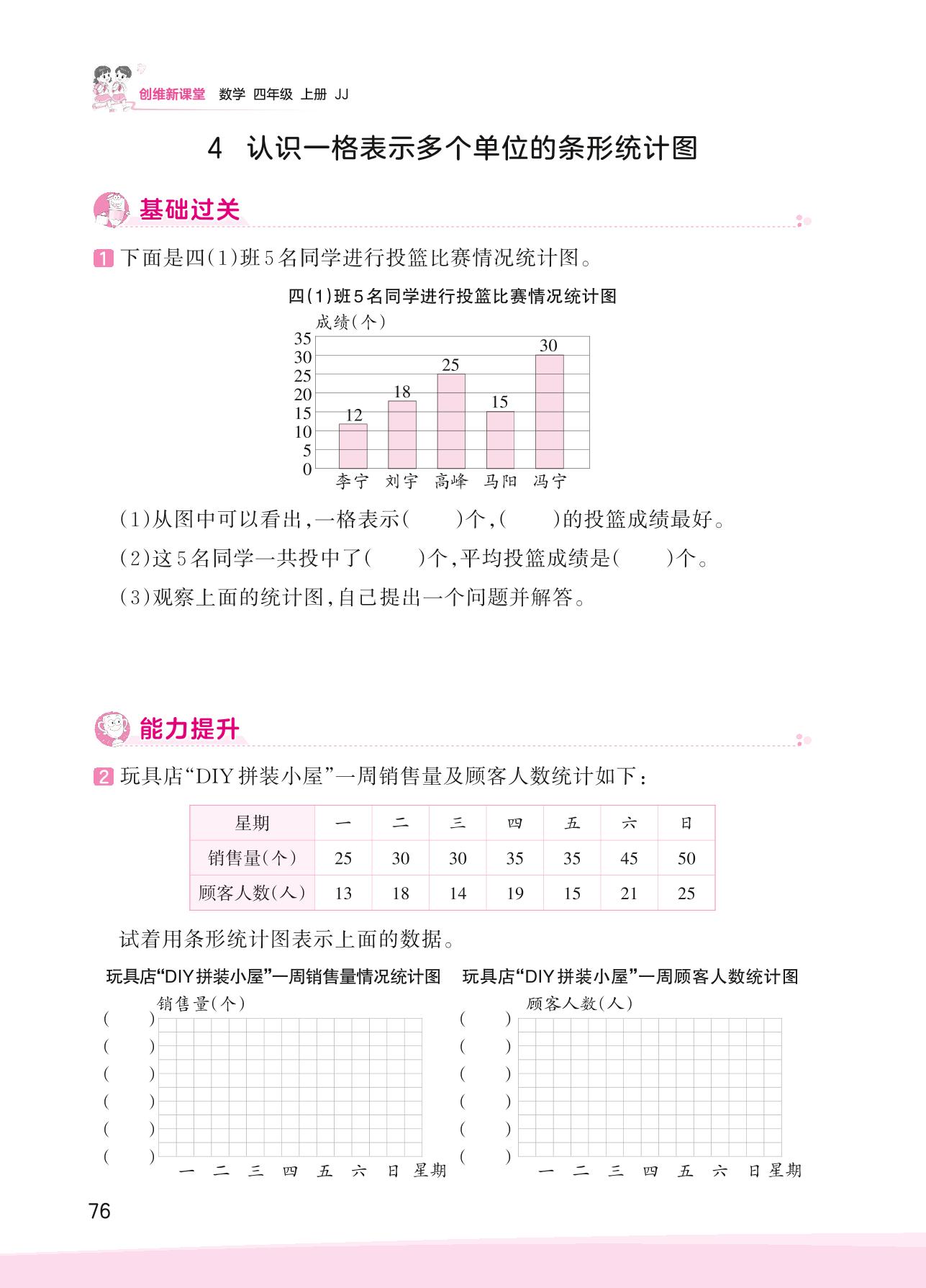 2023上册四年级数学冀教版 八 平均数和条形统计图——4 认识一格表示多个单位的条形统计图
