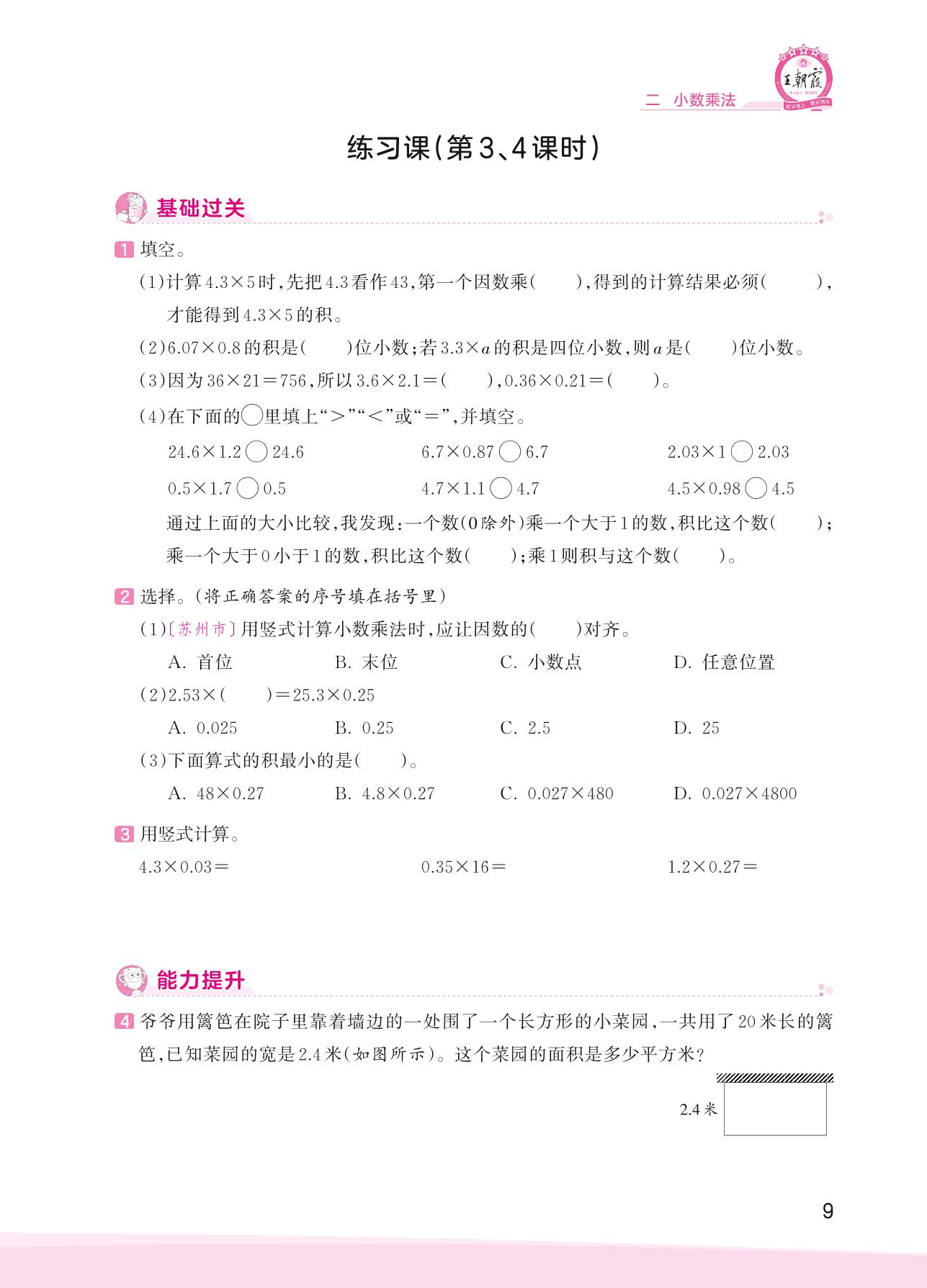 2023上册五年级数学冀教版 二 小数乘法——练习课(第3、4课时)