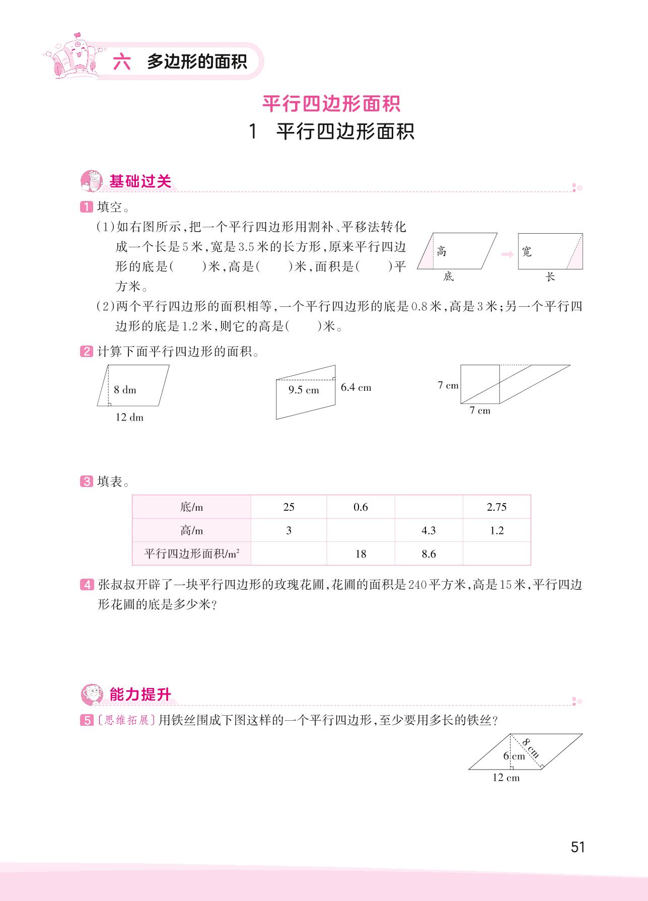 2023上册五年级数学冀教版 六 多边形的面积——1 平行四边形面积