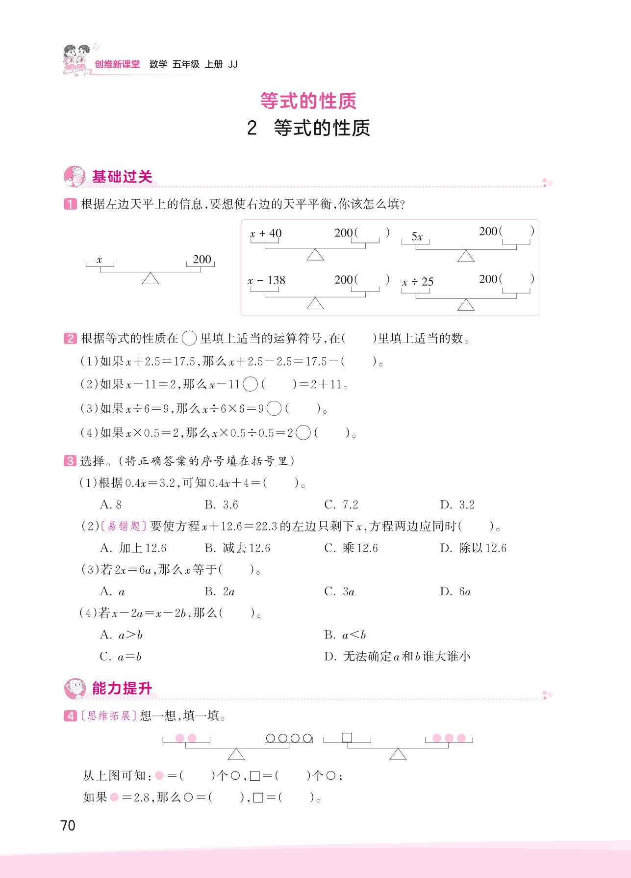 2023上册五年级数学冀教版 八 方程——2 等式的性质