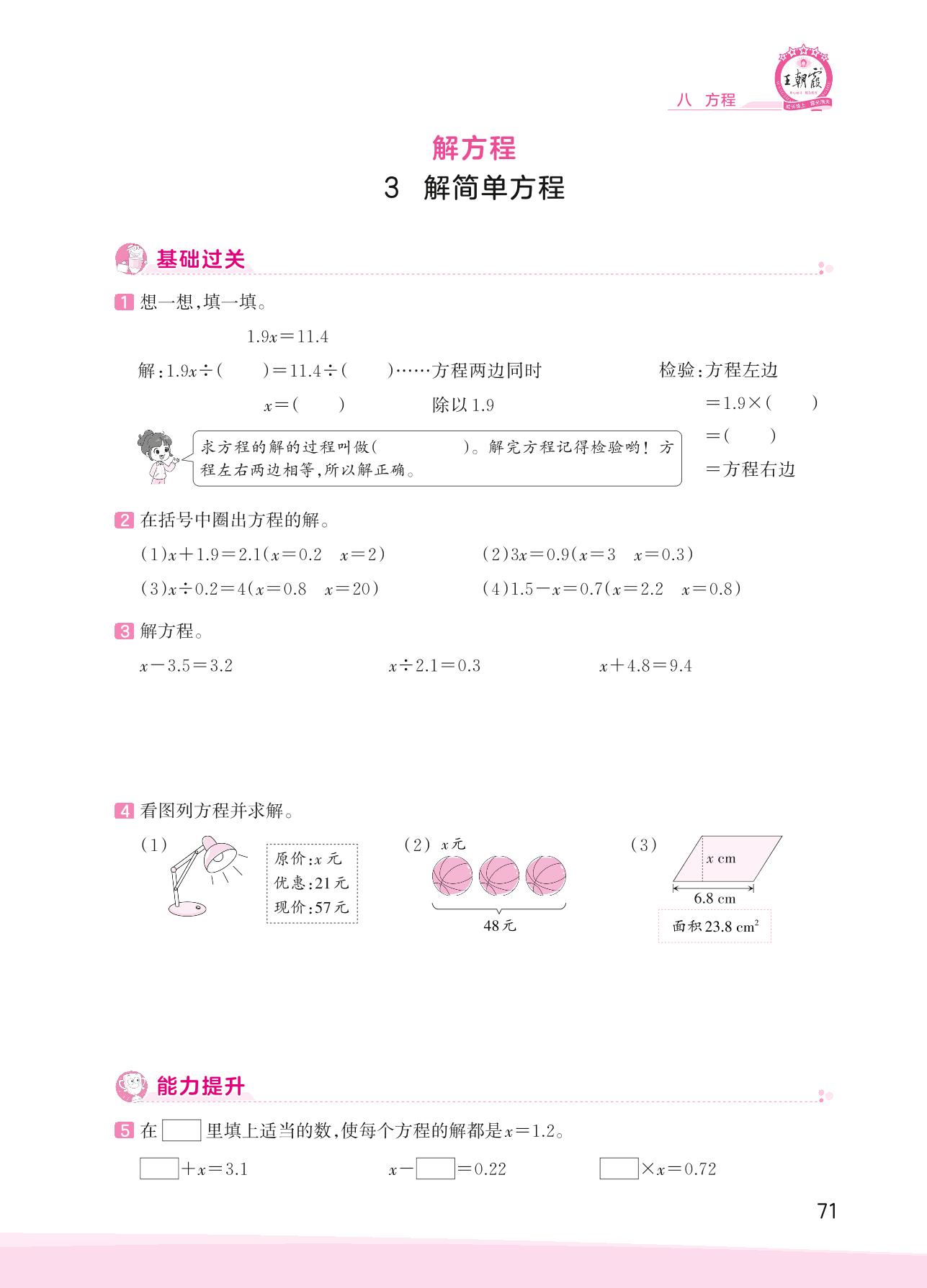 2023上册五年级数学冀教版 八 方程——3 解简单方程