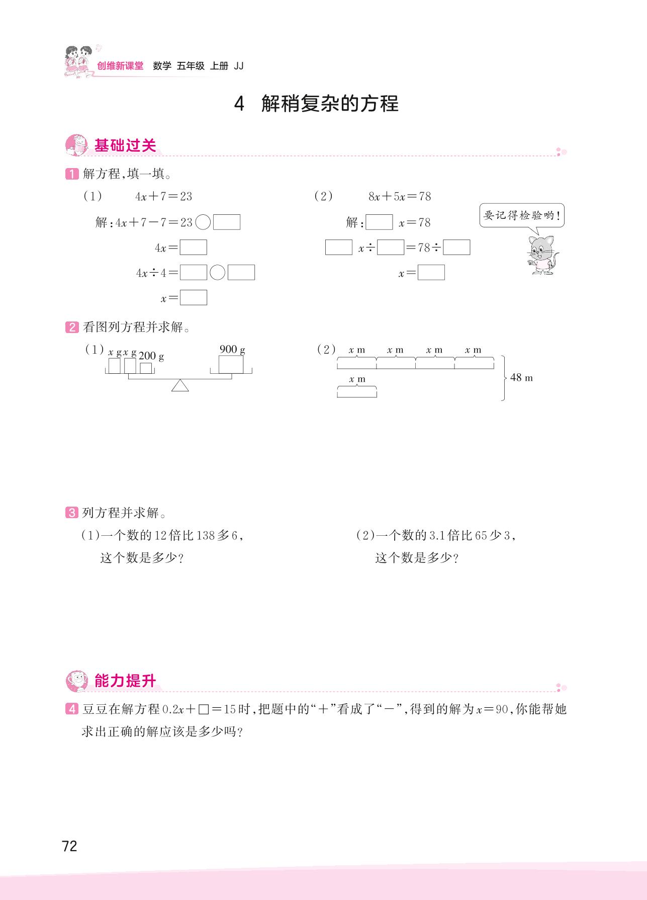 2023上册五年级数学冀教版 八 方程——4 解稍复杂的方程