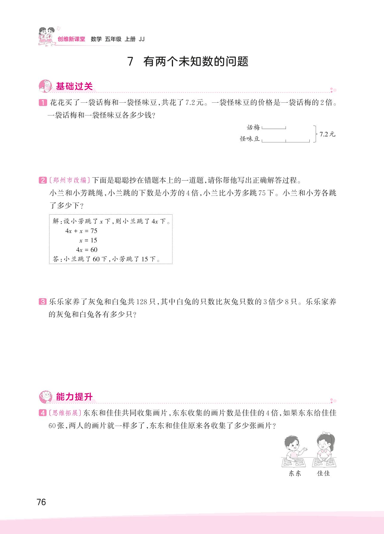 2023上册五年级数学冀教版 八 方程——7 有两个未知数的问题