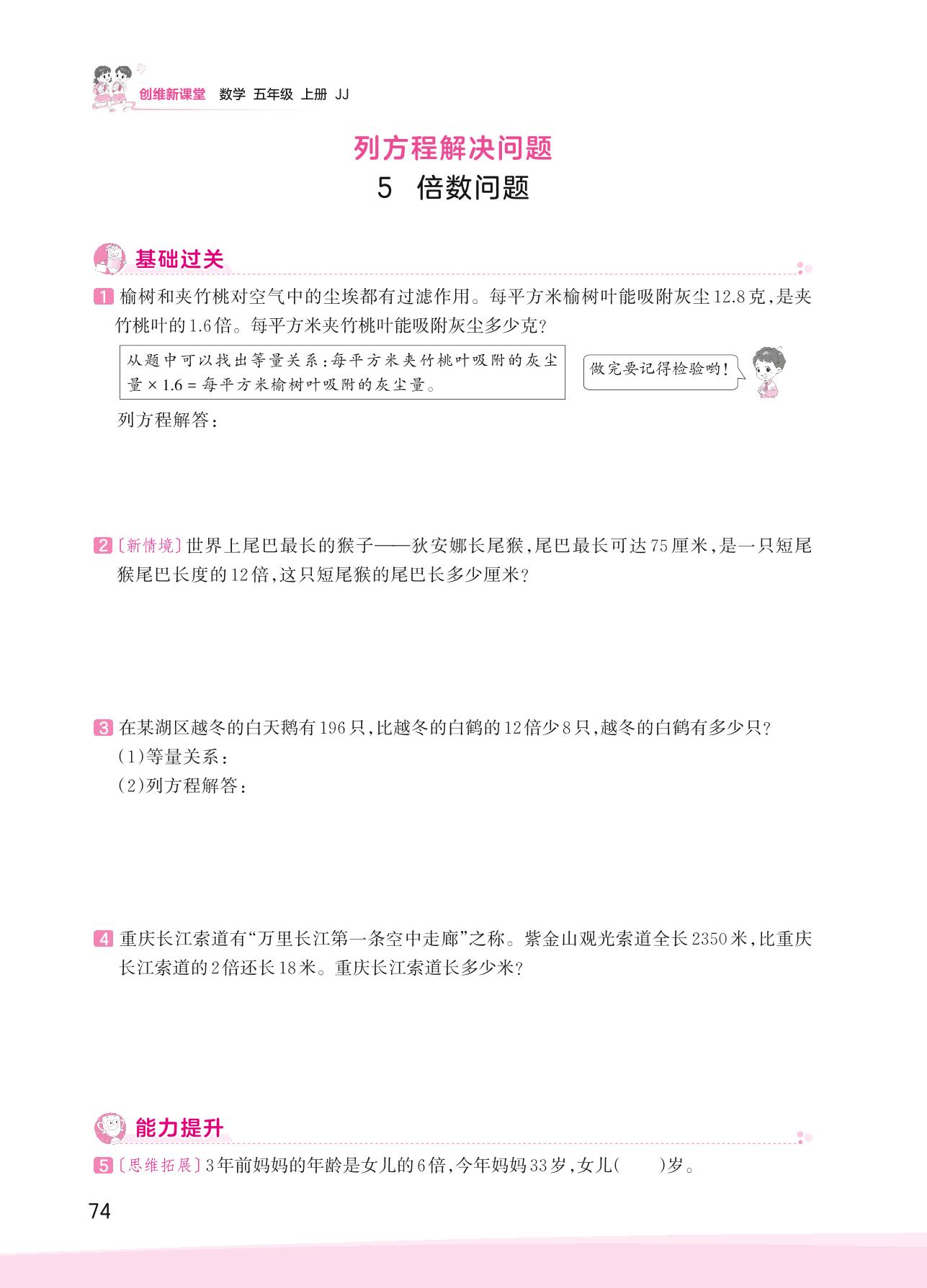2023上册五年级数学冀教版 八 方程——5 倍数问题