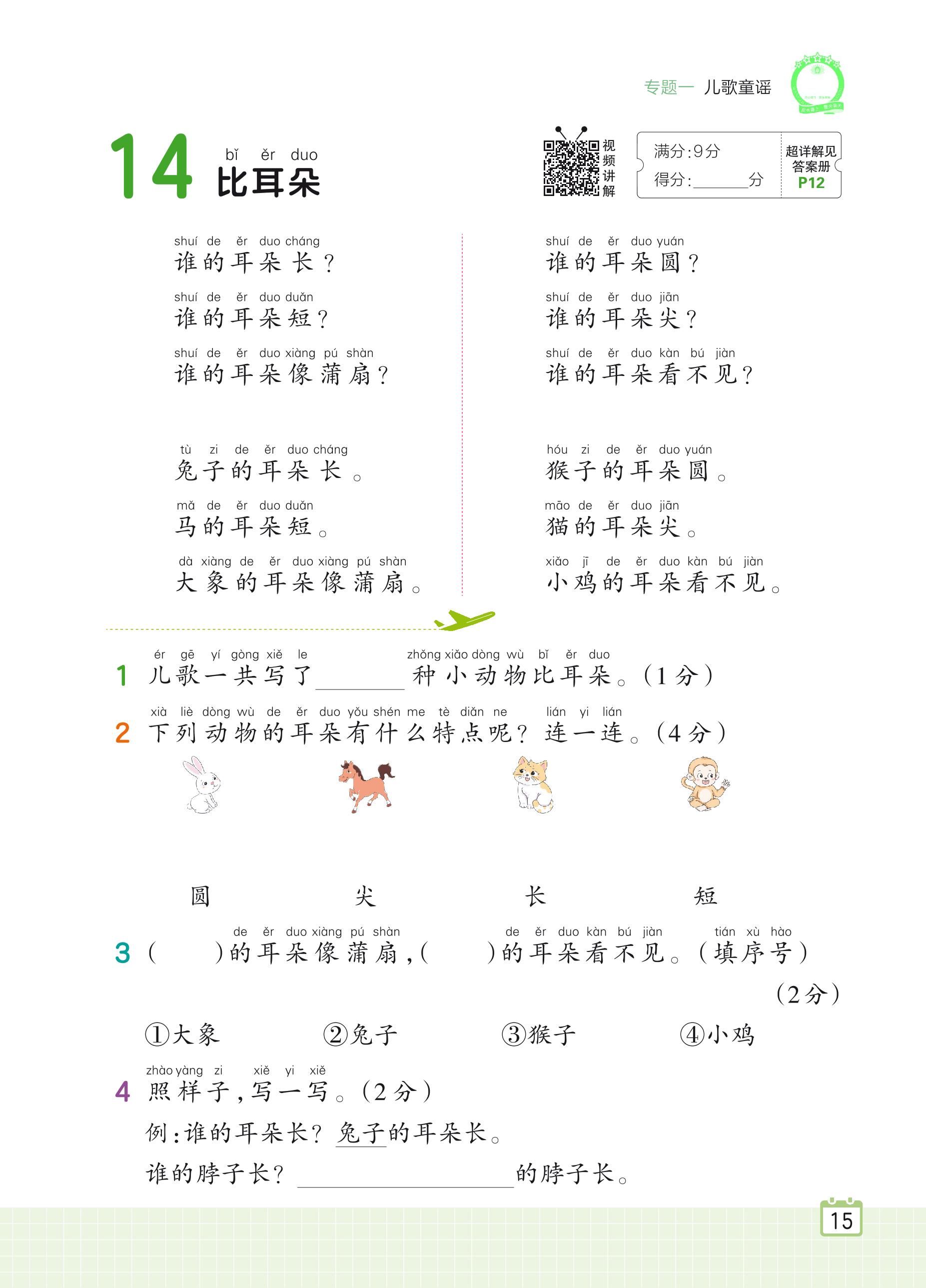 2024全一册一年级语文人教版 专题一 儿童童谣 14 比耳朵
