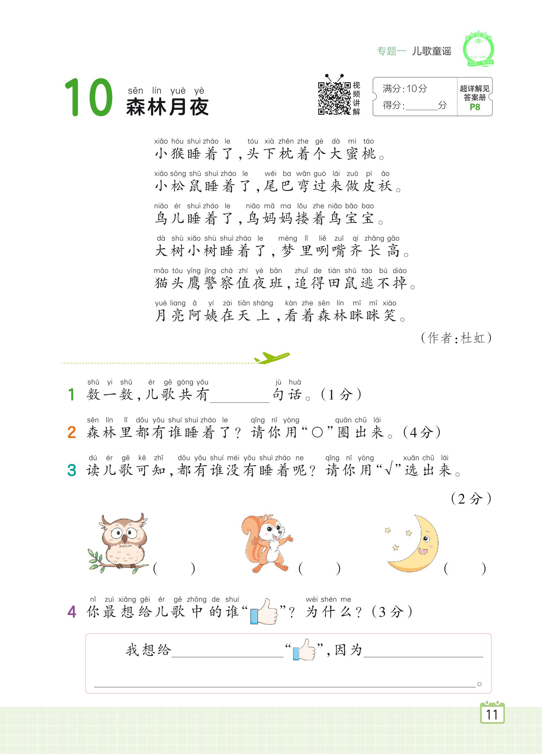 2024全一册一年级语文人教版 专题一 儿童童谣 10 森林月夜