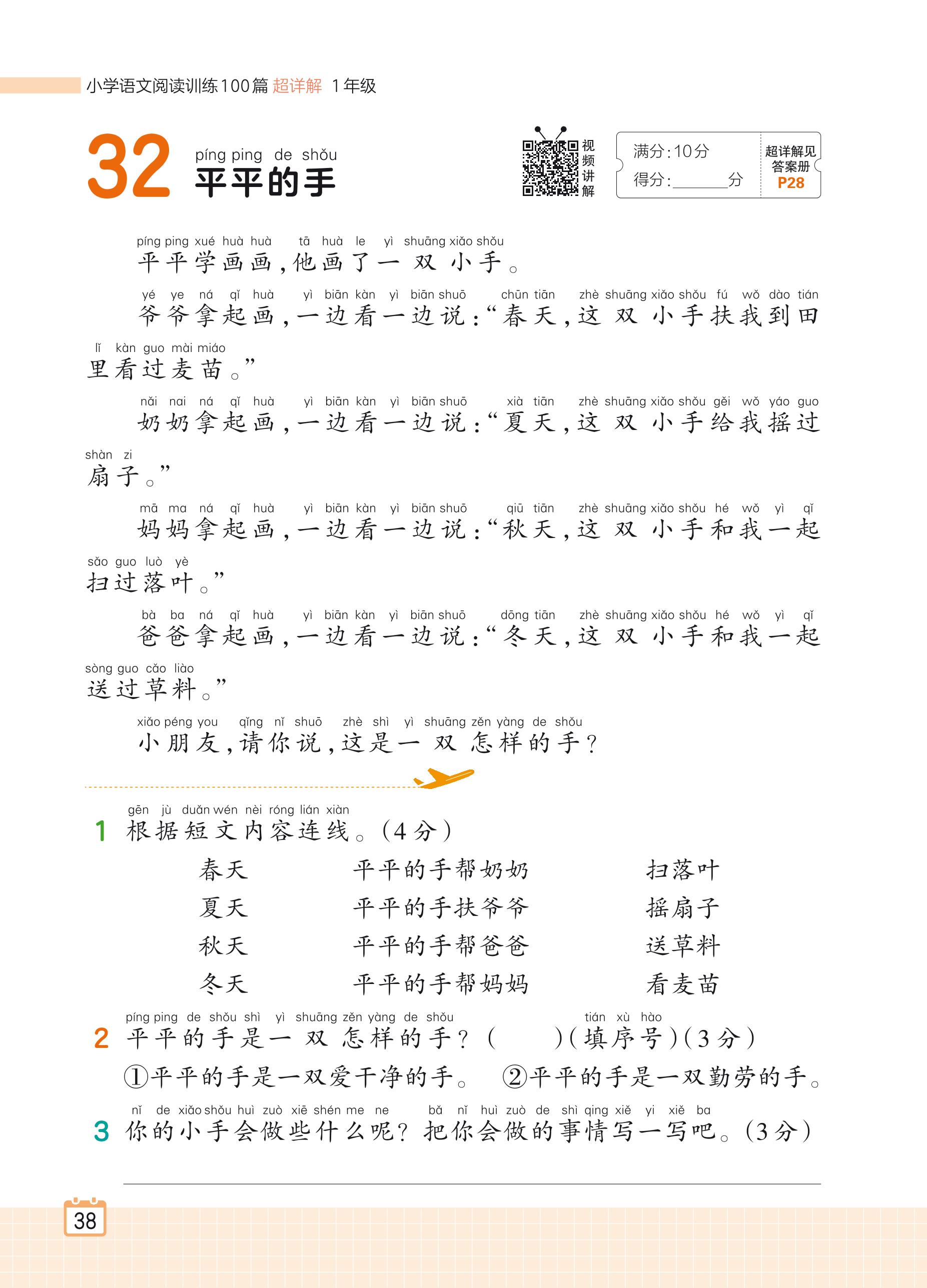 2024全一册一年级语文人教版 专题二 写人记事 32 平平的手