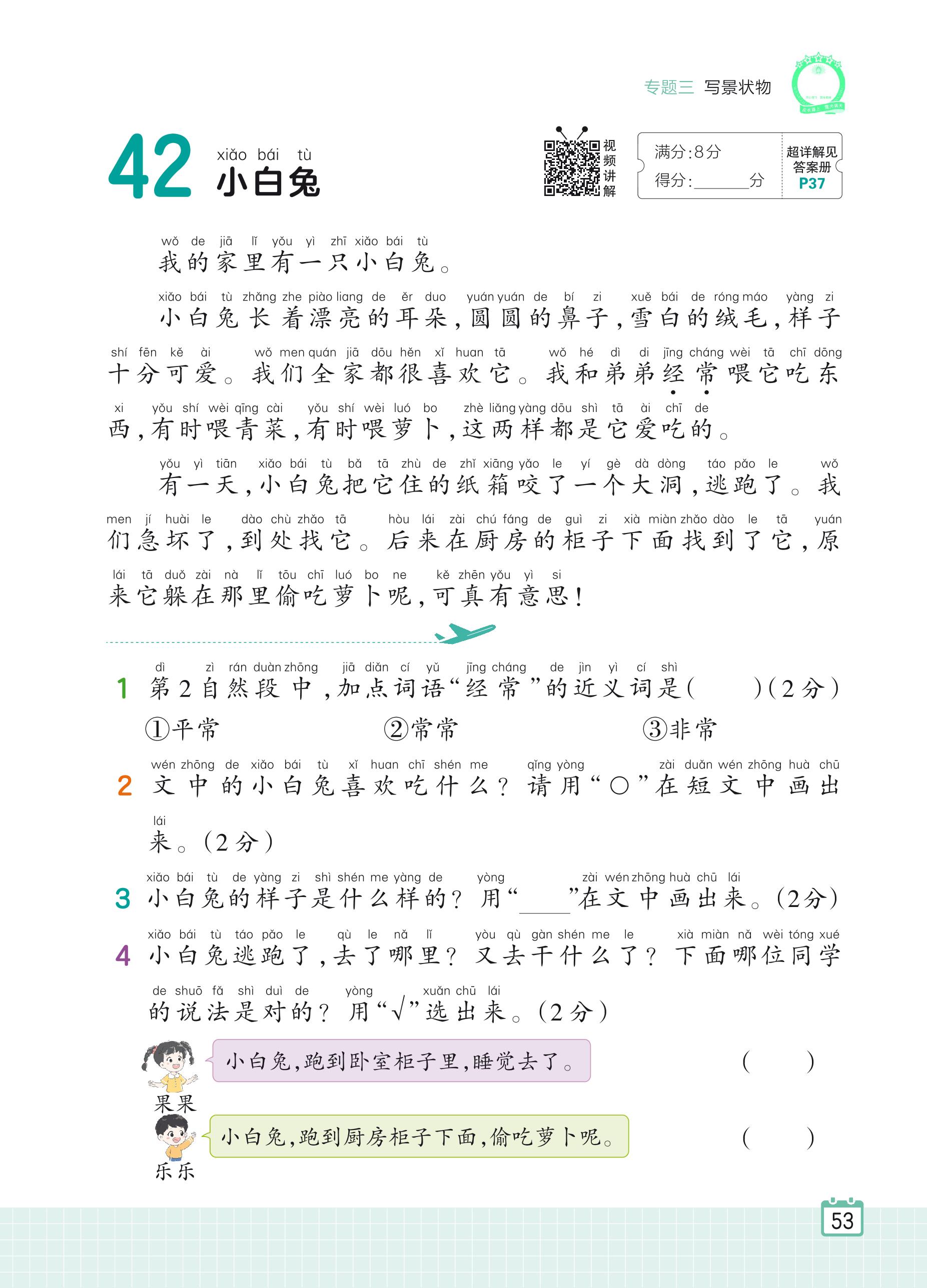 2024全一册一年级语文人教版 专题三 写景状物 42 小白兔