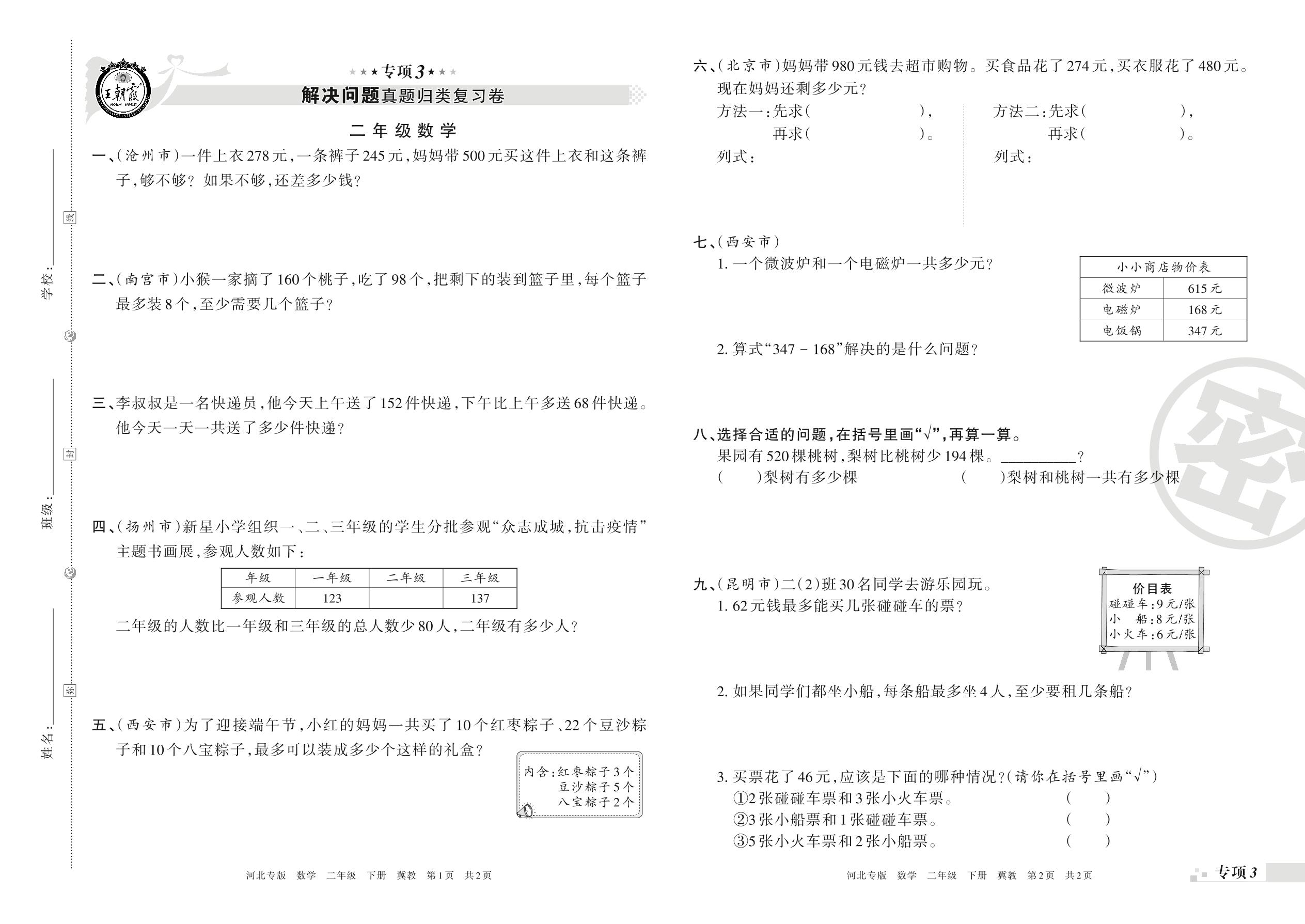 王朝霞期末专项卷——解决问题真题归类复习、新颖题速递:生活与数学二年级下册数学(冀教版)【0】