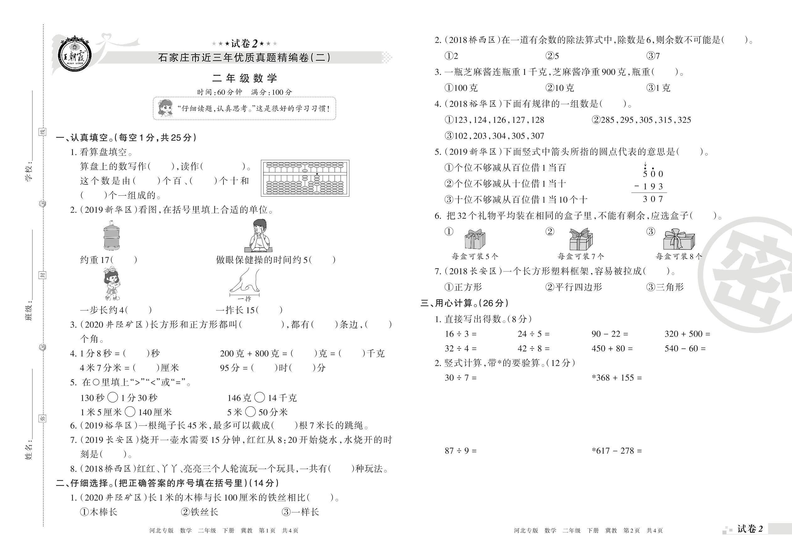 石家庄市近三年优质真题精编卷(二)二年级下册数学(冀教版)【2】