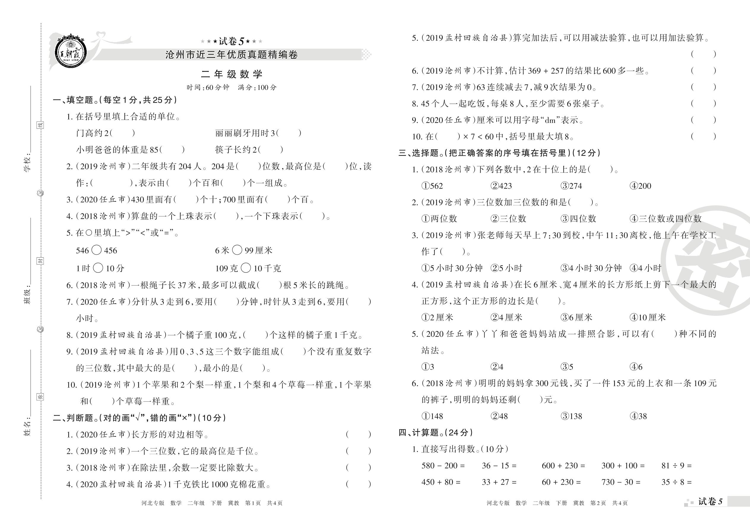 沧州市近三年优质真题精编卷二年级数学试卷(冀教版)【5】