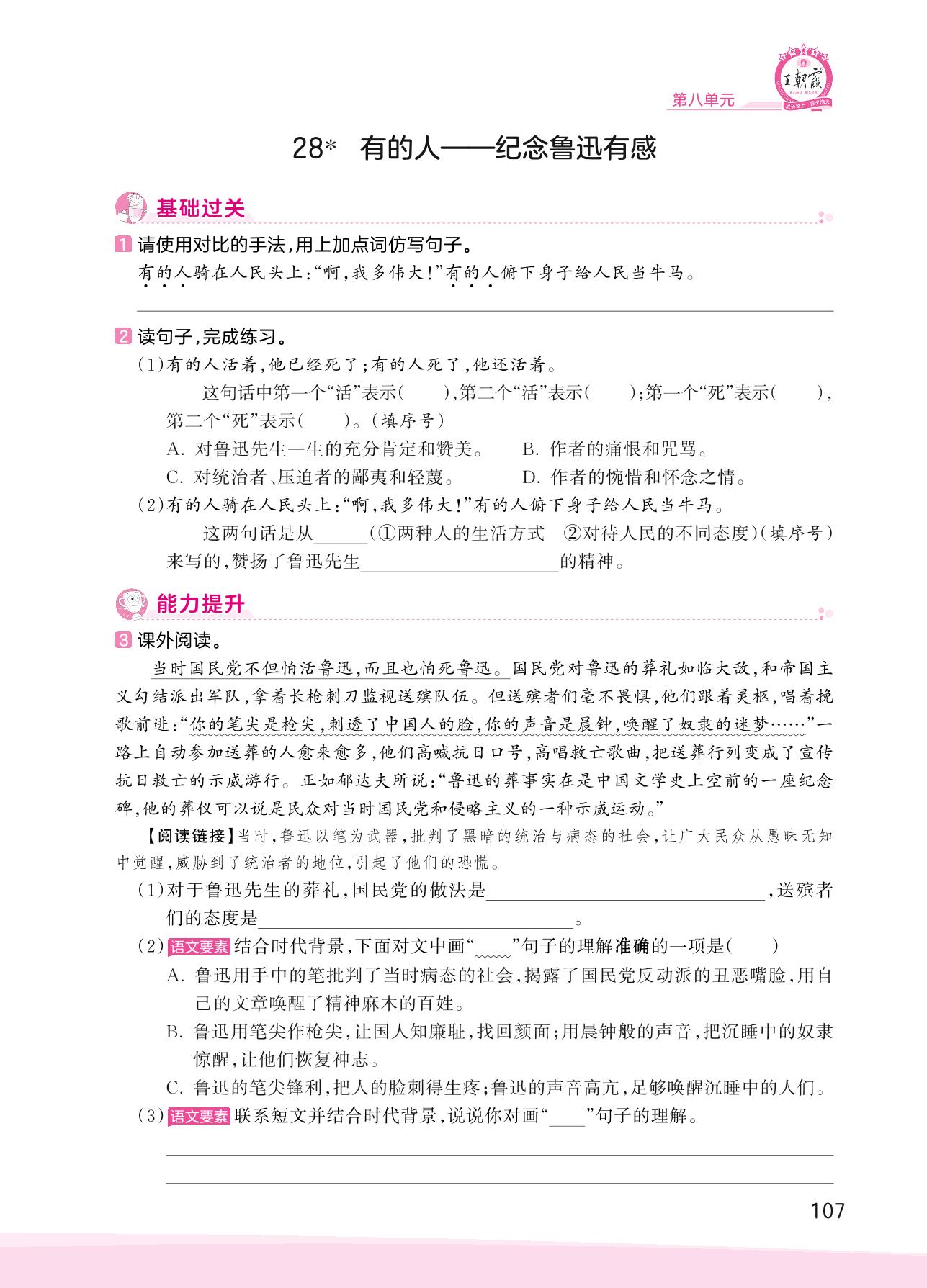 2023上册六年级语文人教版 第八单元 走近鲁迅——28 有的人——纪念鲁迅有感