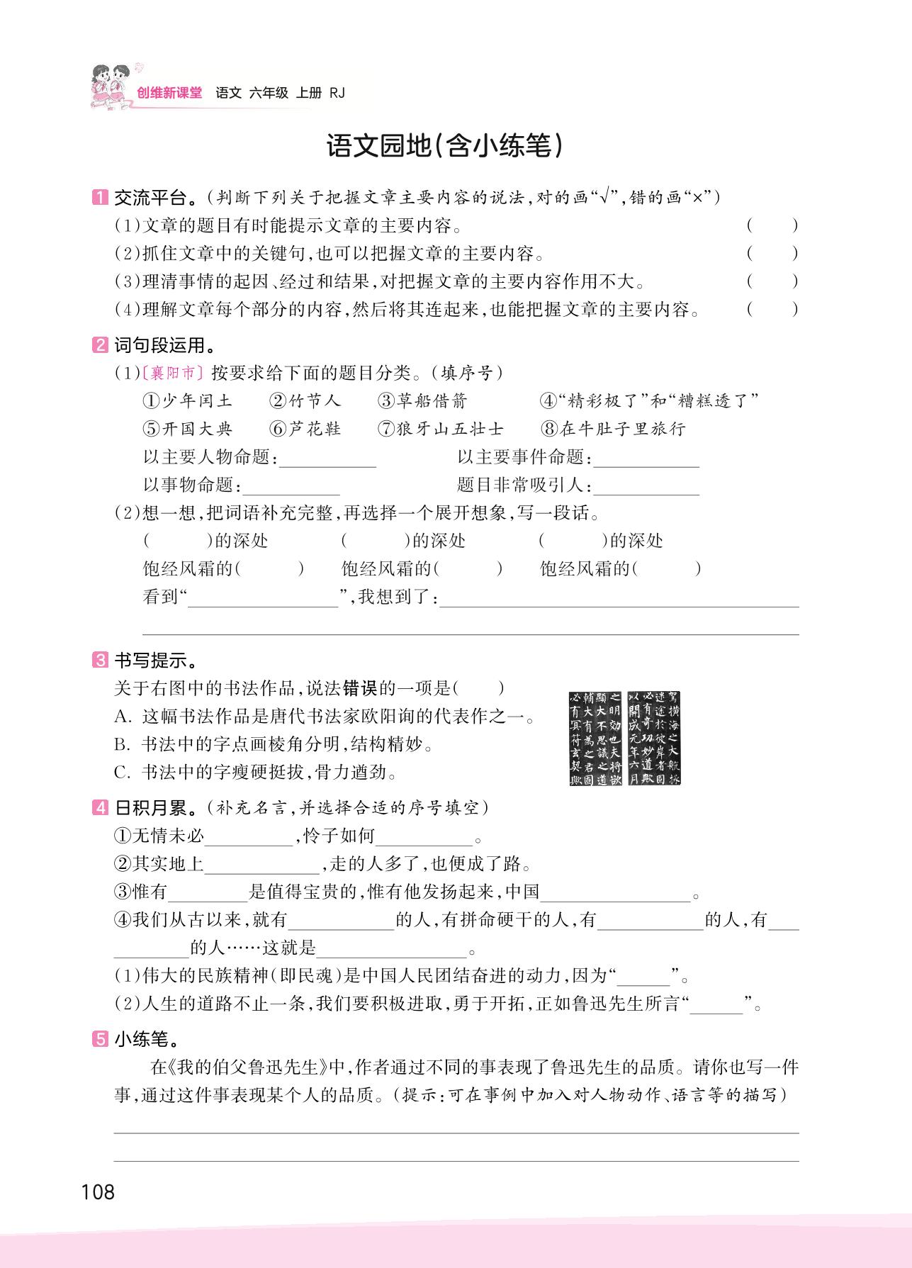 2023上册六年级语文人教版 第八单元 走近鲁迅——语文园地[含小练笔]