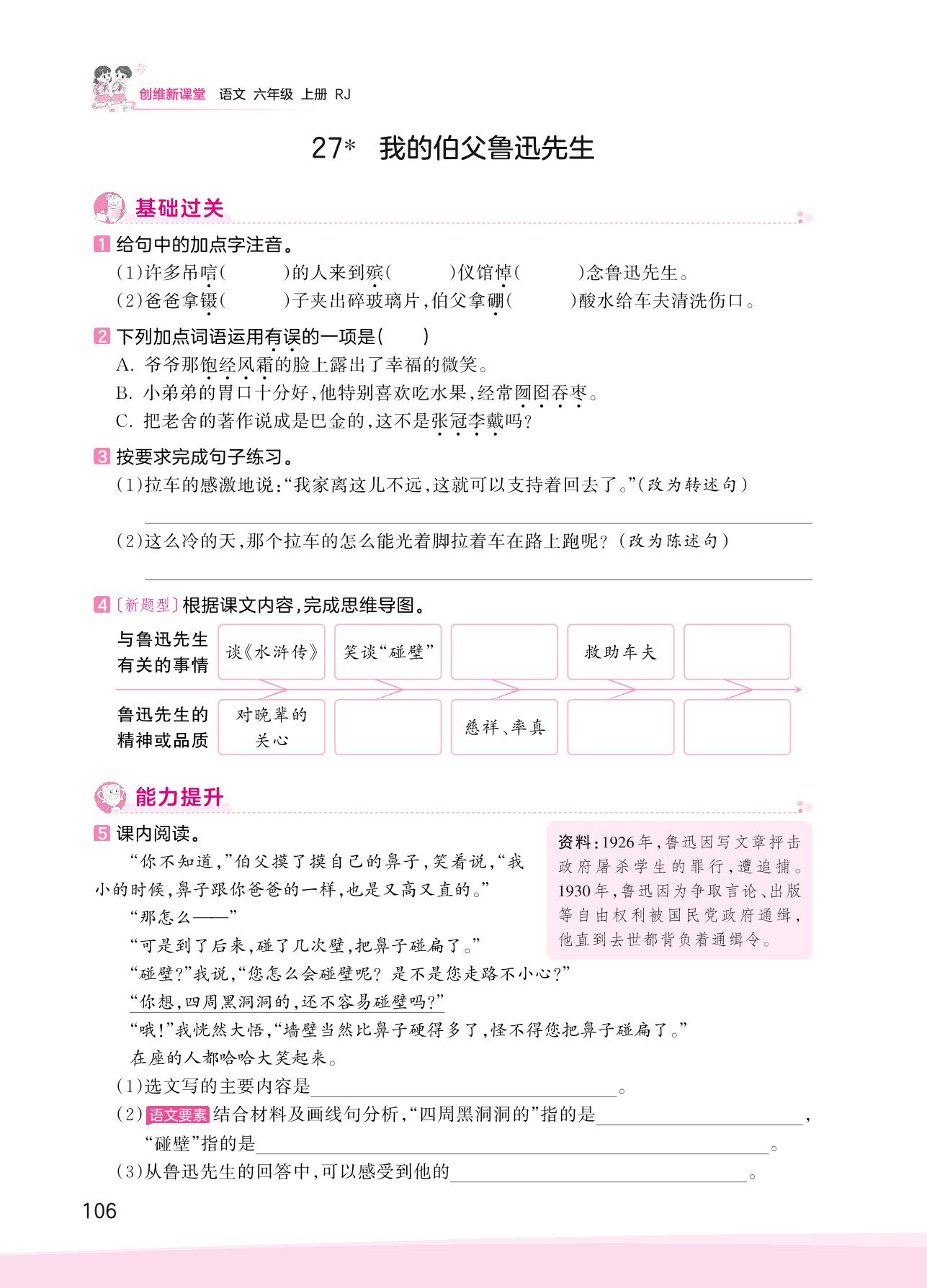 2023上册六年级语文人教版 第八单元 走近鲁迅——27 我的伯父鲁迅先生