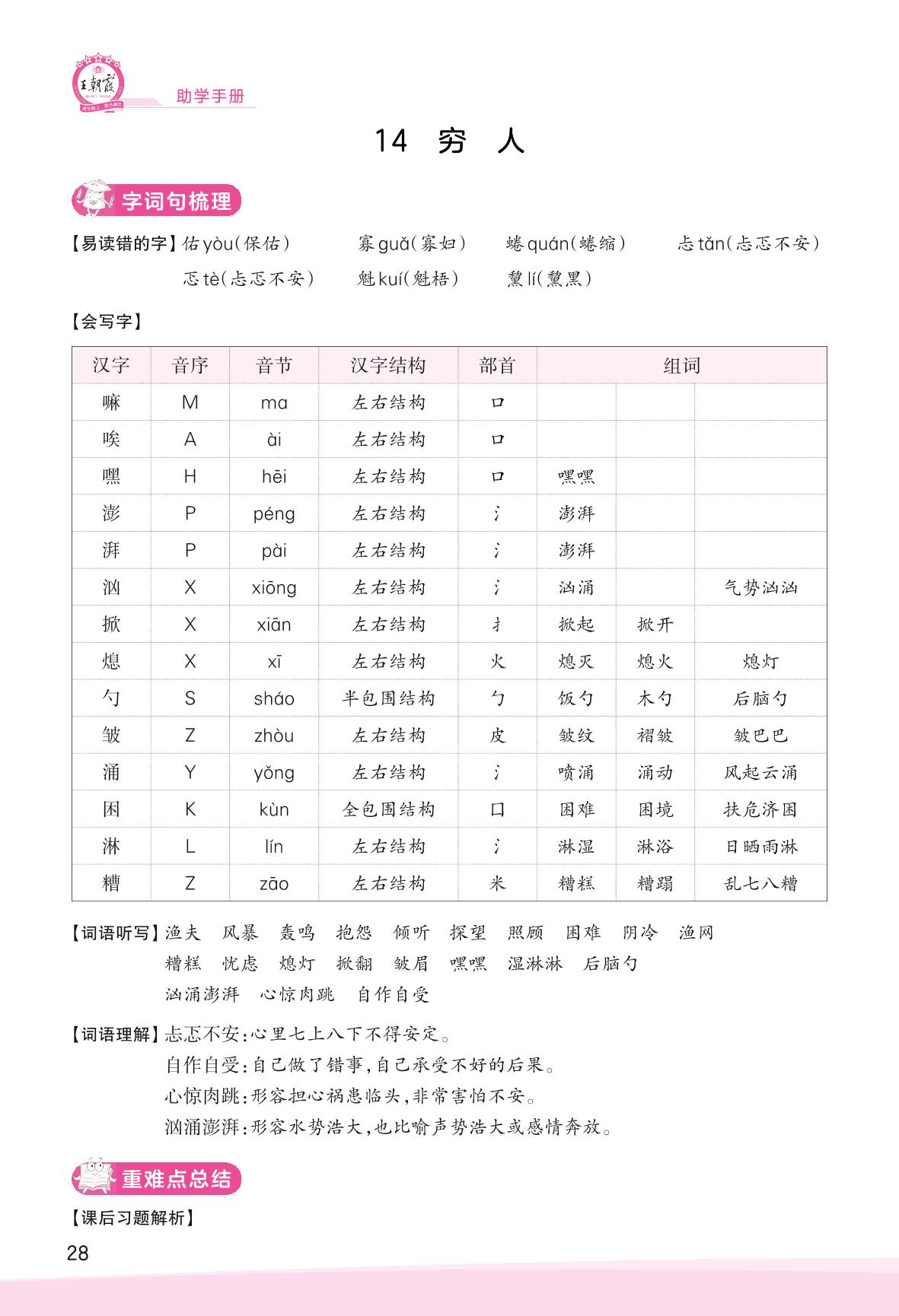 2023上册六年级语文人教版 助学手册 第四单元——14 穷人