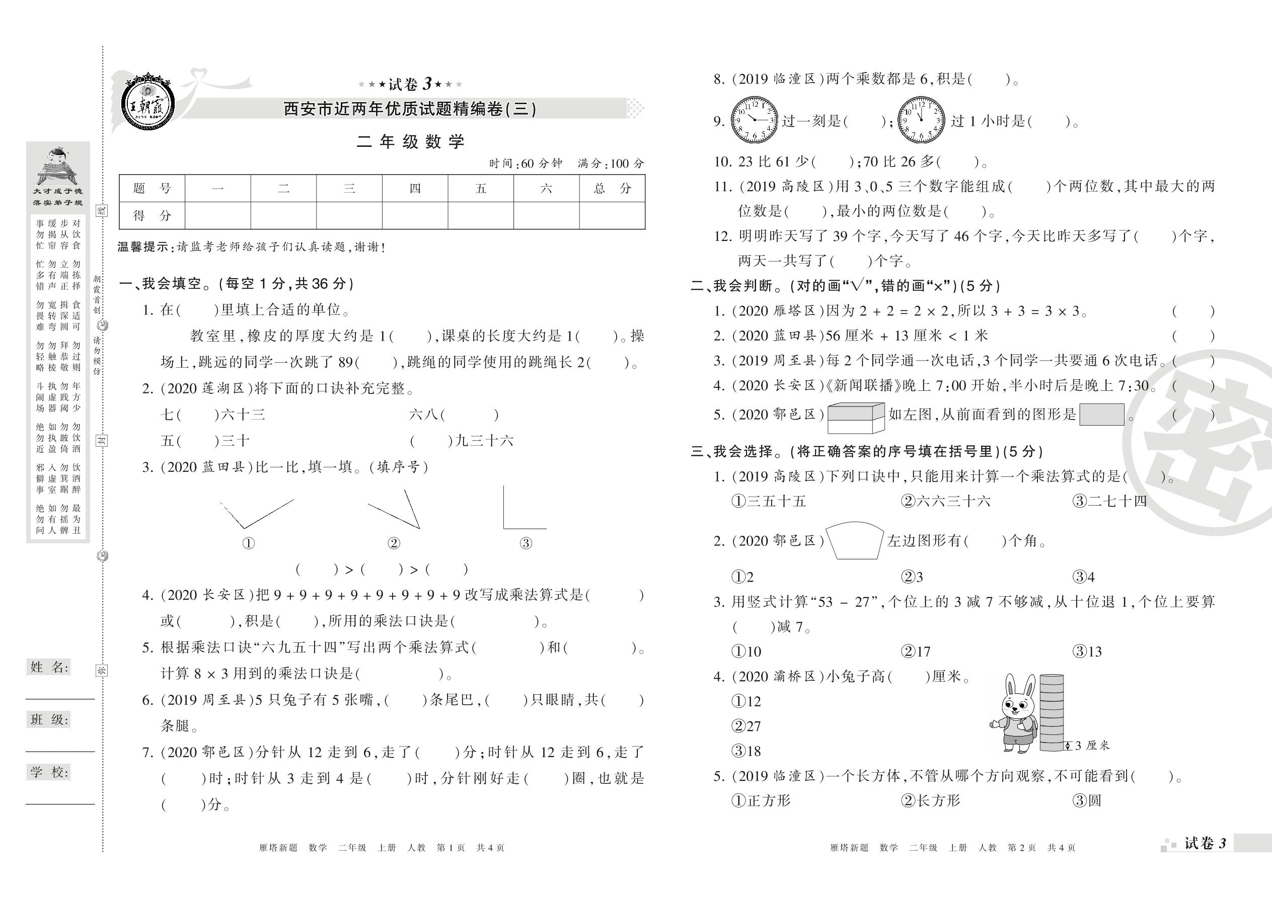 西安市近两年优质试题精编卷(三)二年级上册数学(人教版)【3】