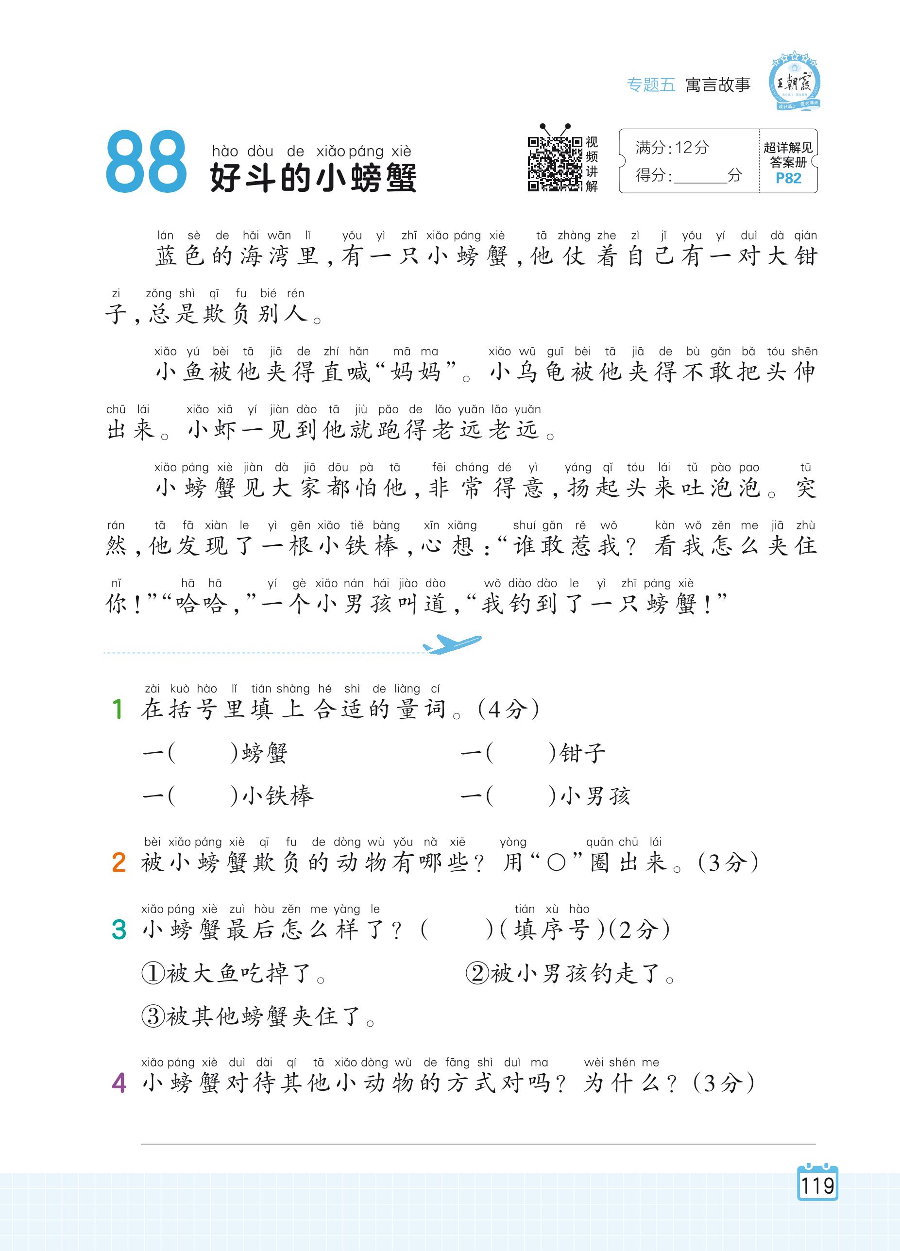 2024全一册一年级语文人教版 专题五 寓言故事 88 好斗的小螃蟹