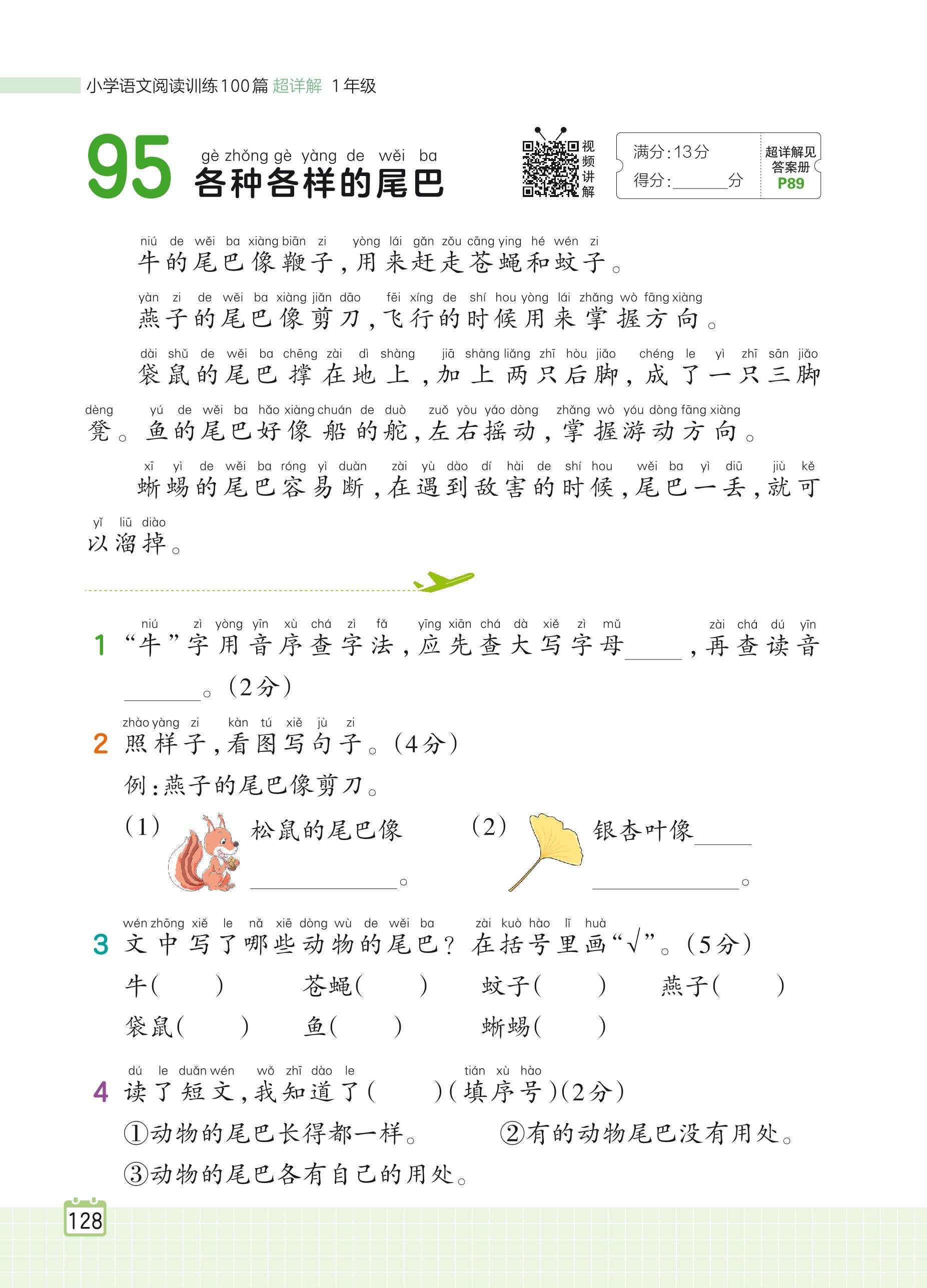 2024全一册一年级语文人教版 专题六 科普生活 95 各种各样的尾巴