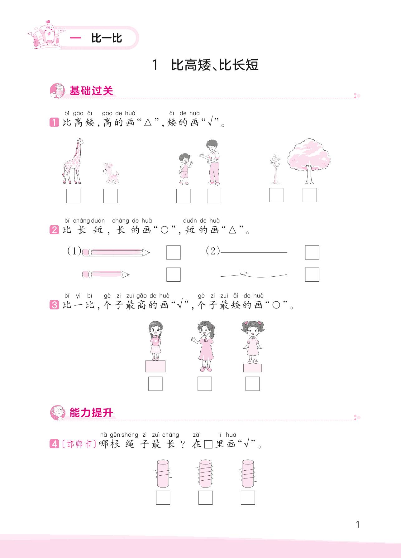 2023上册一年级数学冀教版 一 比一比——1 比高矮、比长短