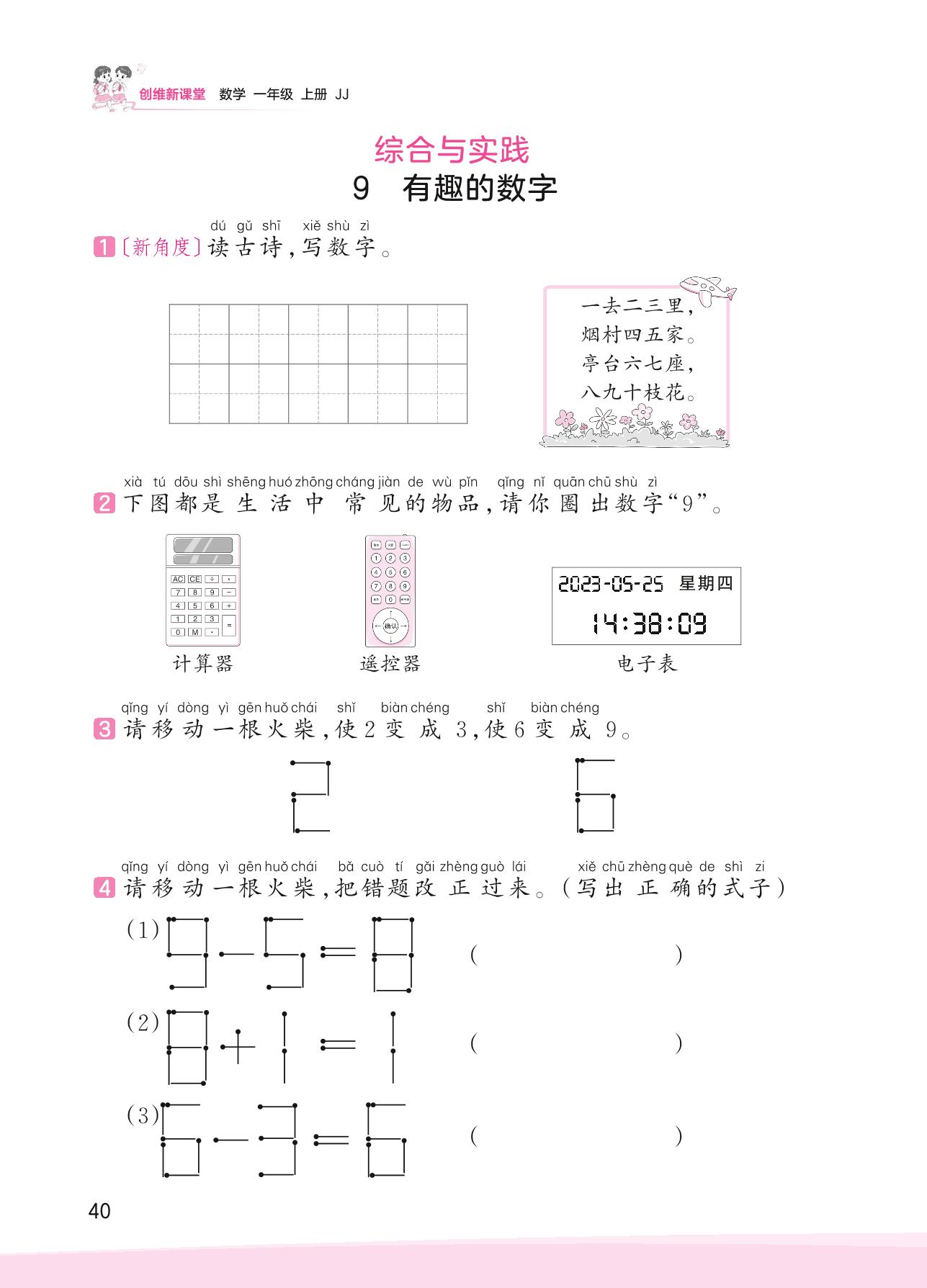 2023上册一年级数学冀教版 五 10以内的加法和减法——9 有趣的数字