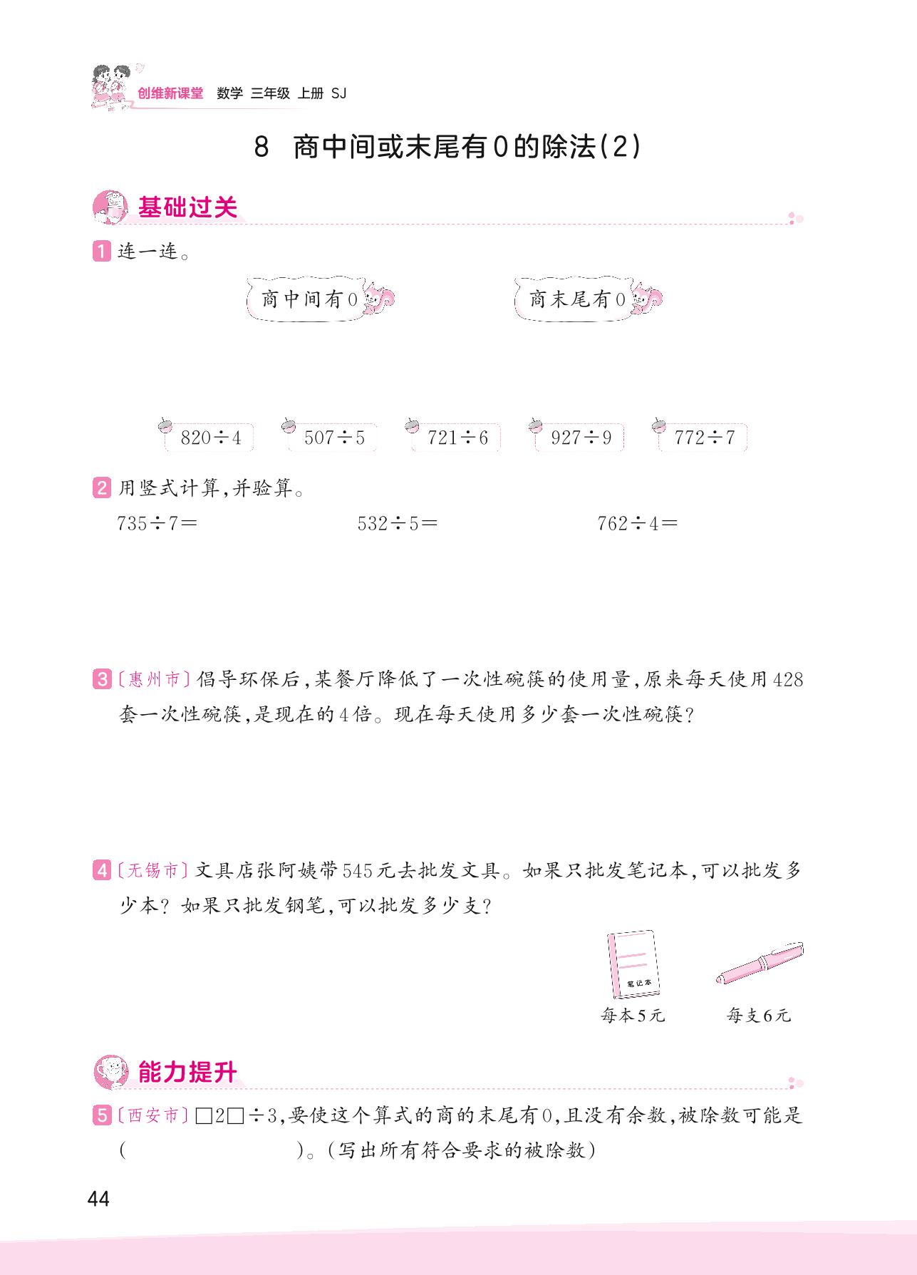 2023上册三年级数学苏教版 四 两、三位数除以一位数——8 商中间或末尾有0的除法(2)