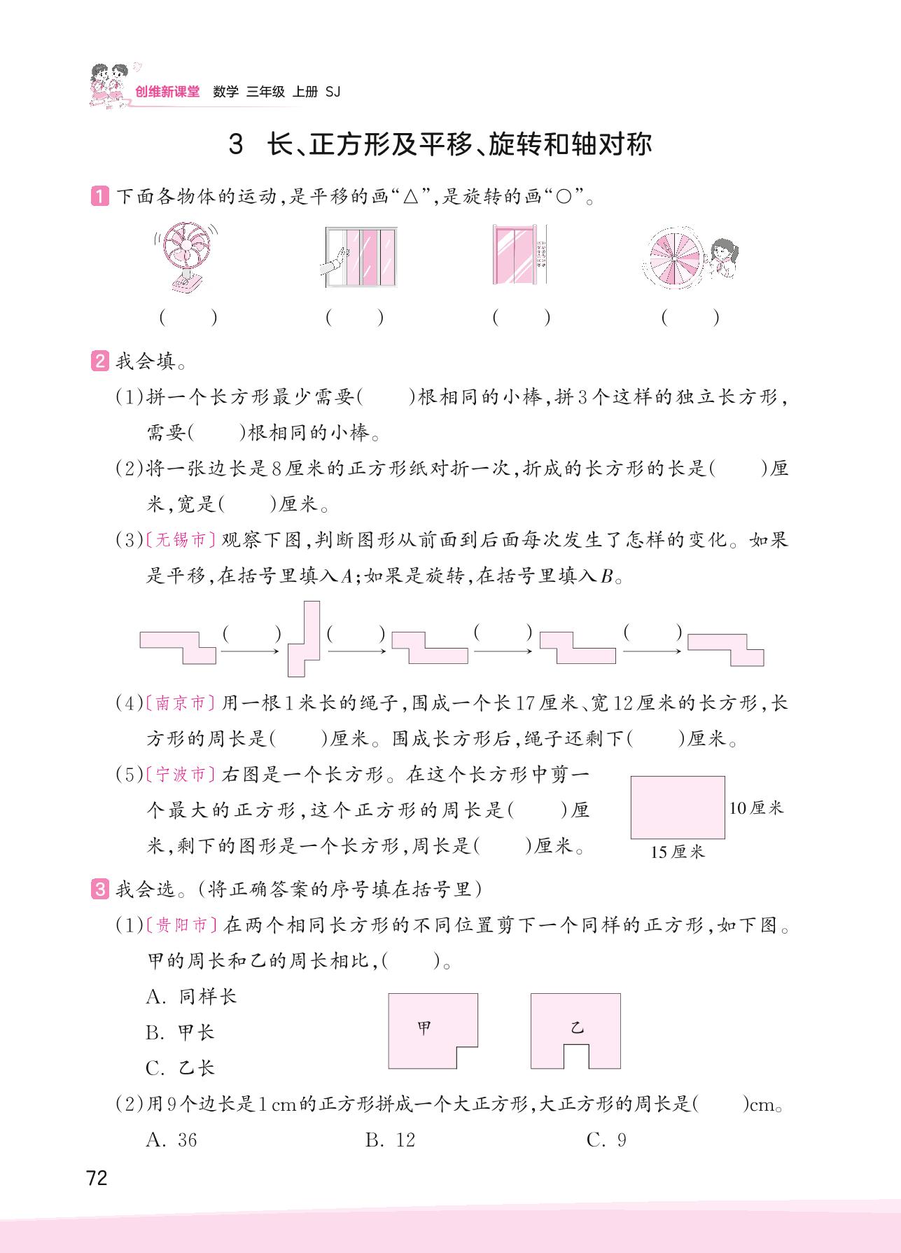 2023上册三年级数学苏教版 八 期末复习——3 长、正方形及平移、旋转和轴对称