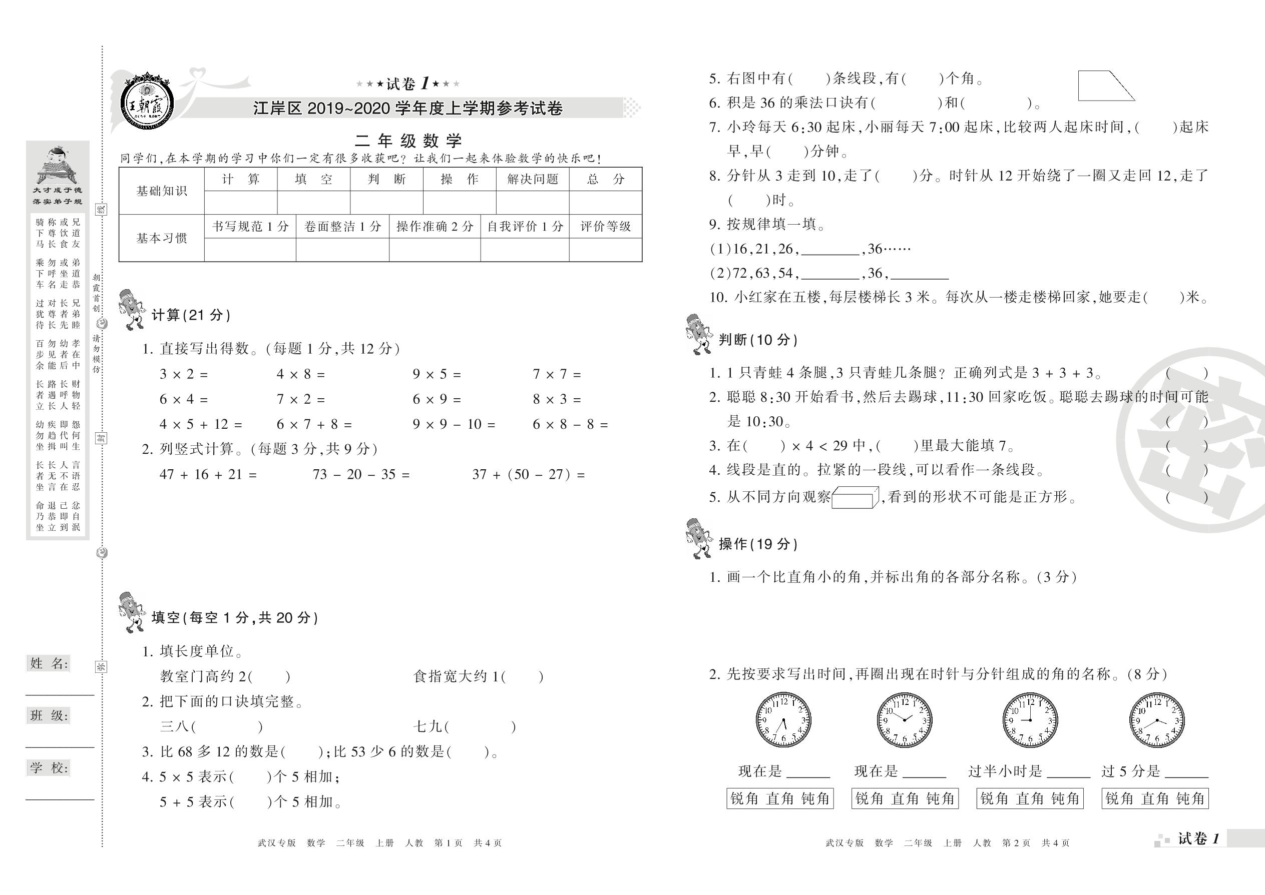 2019-2020学年第一学期武汉市江岸区二年级数学试卷(人教版)【1】