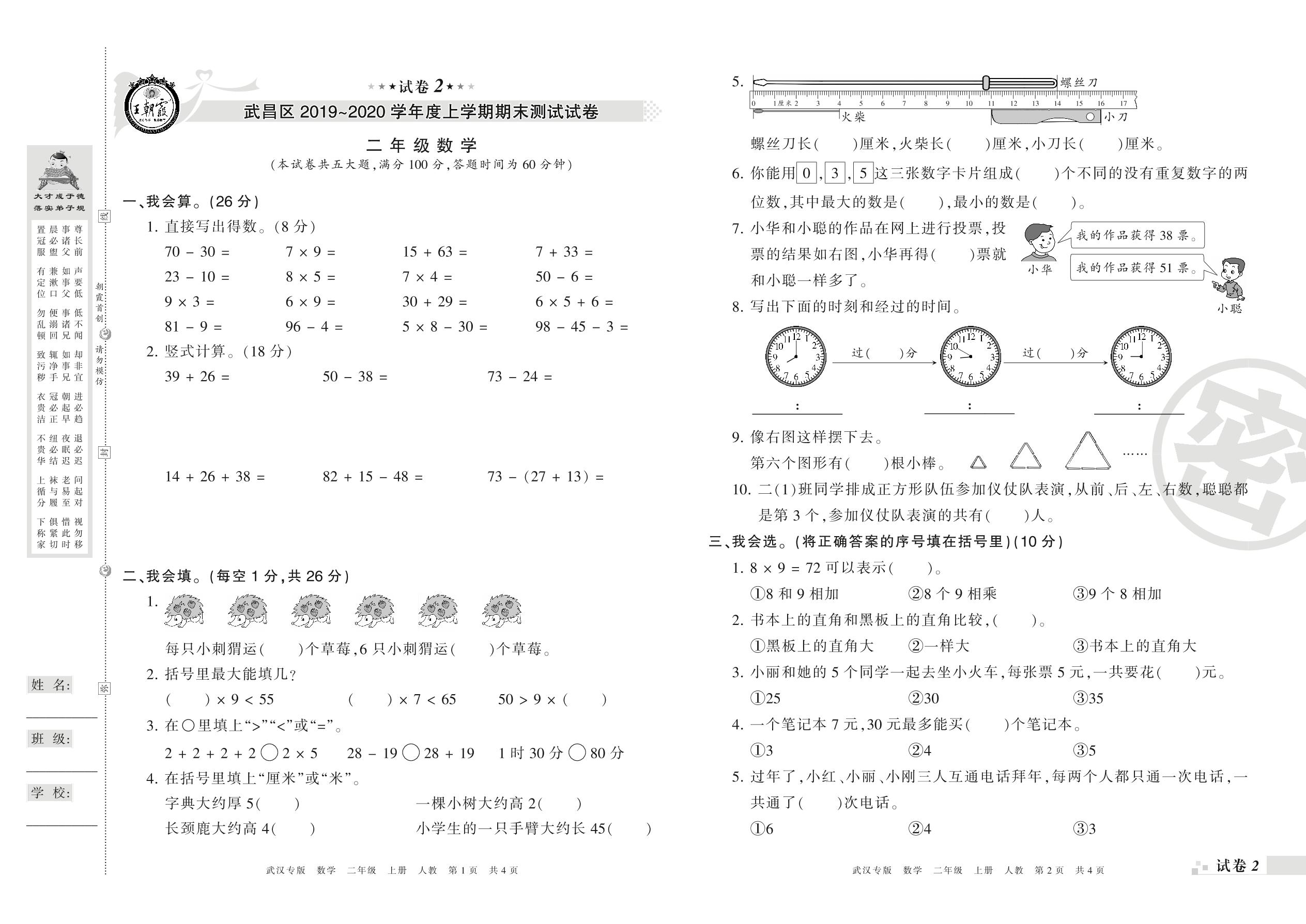 2019-2020学年第一学期武汉市武昌区二年级数学试卷(人教版)【2】