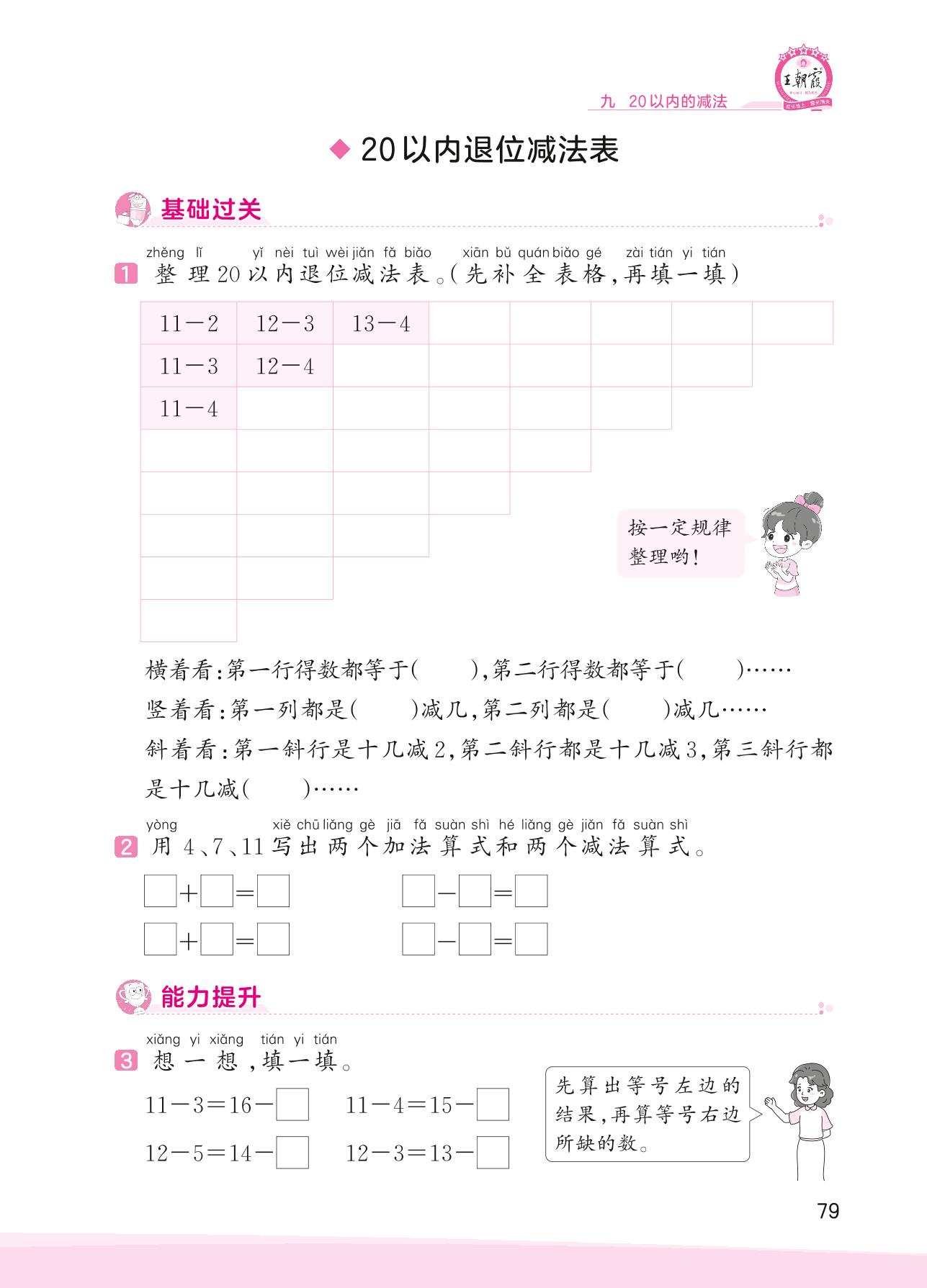 2023上册一年级数学冀教版 九 20以内的减法——20以内退位减法表