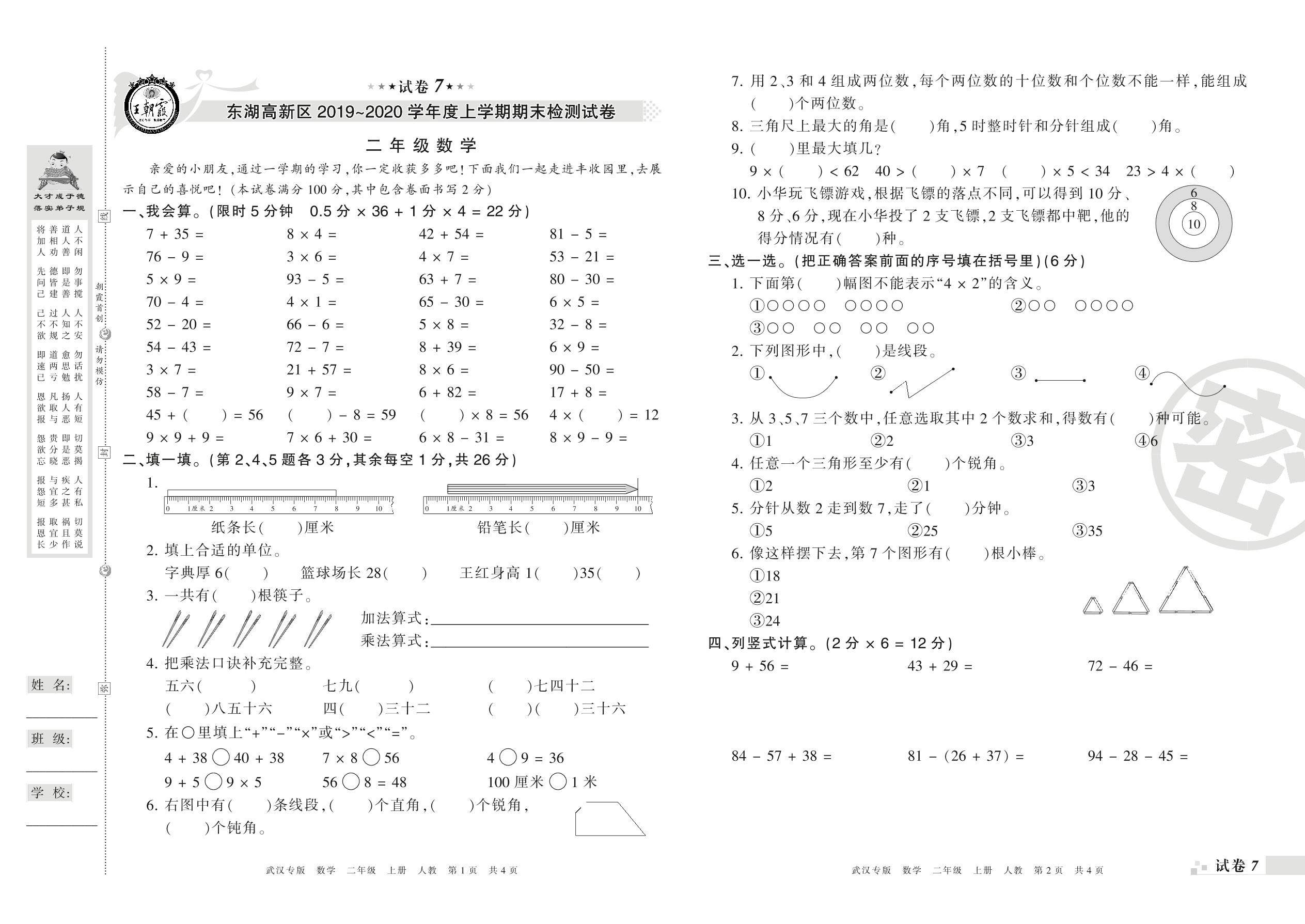2019-2020学年第一学期武汉市东湖高新区二年级数学试卷(人教版)【7】