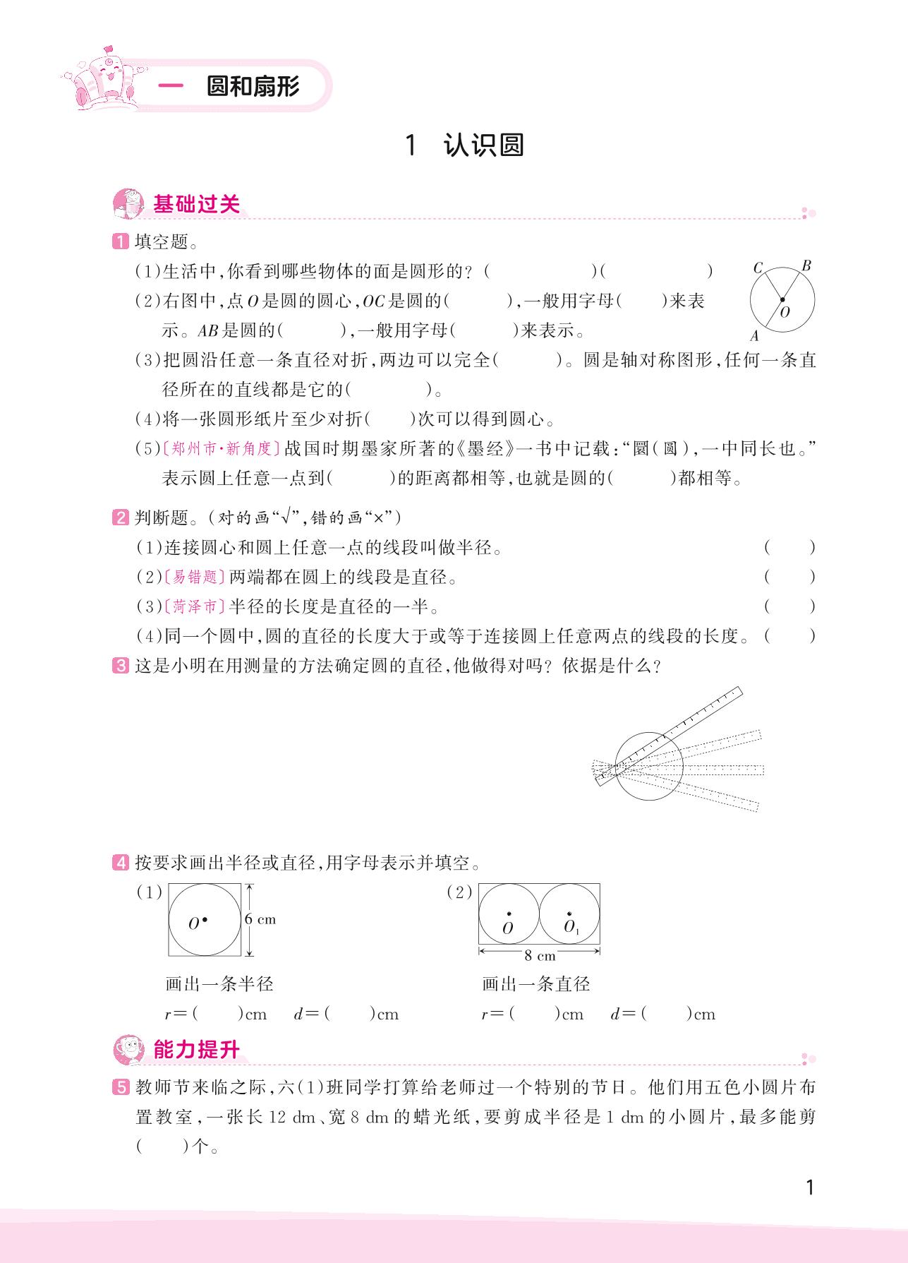 2023上册六年级数学冀教版 一 圆和扇形——1 认识圆