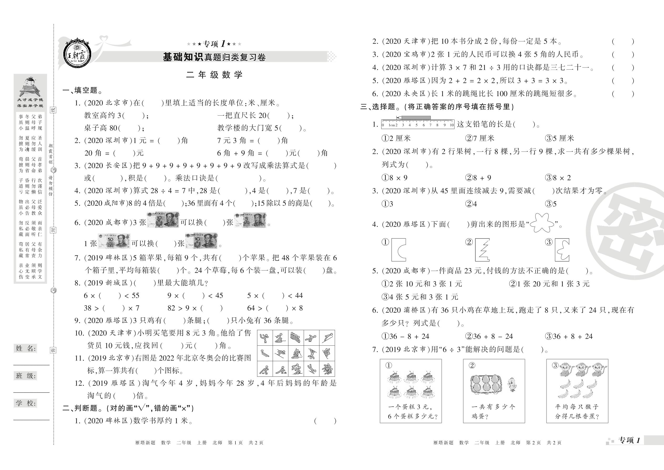 王朝霞期末专项卷——基础知识、计算真题归类复习二年级上册数学(北师版)_R21080384144【0】