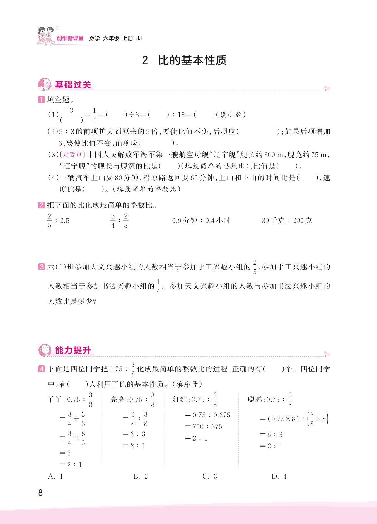 2023上册六年级数学冀教版 二 比和比例——2 比的基本性质