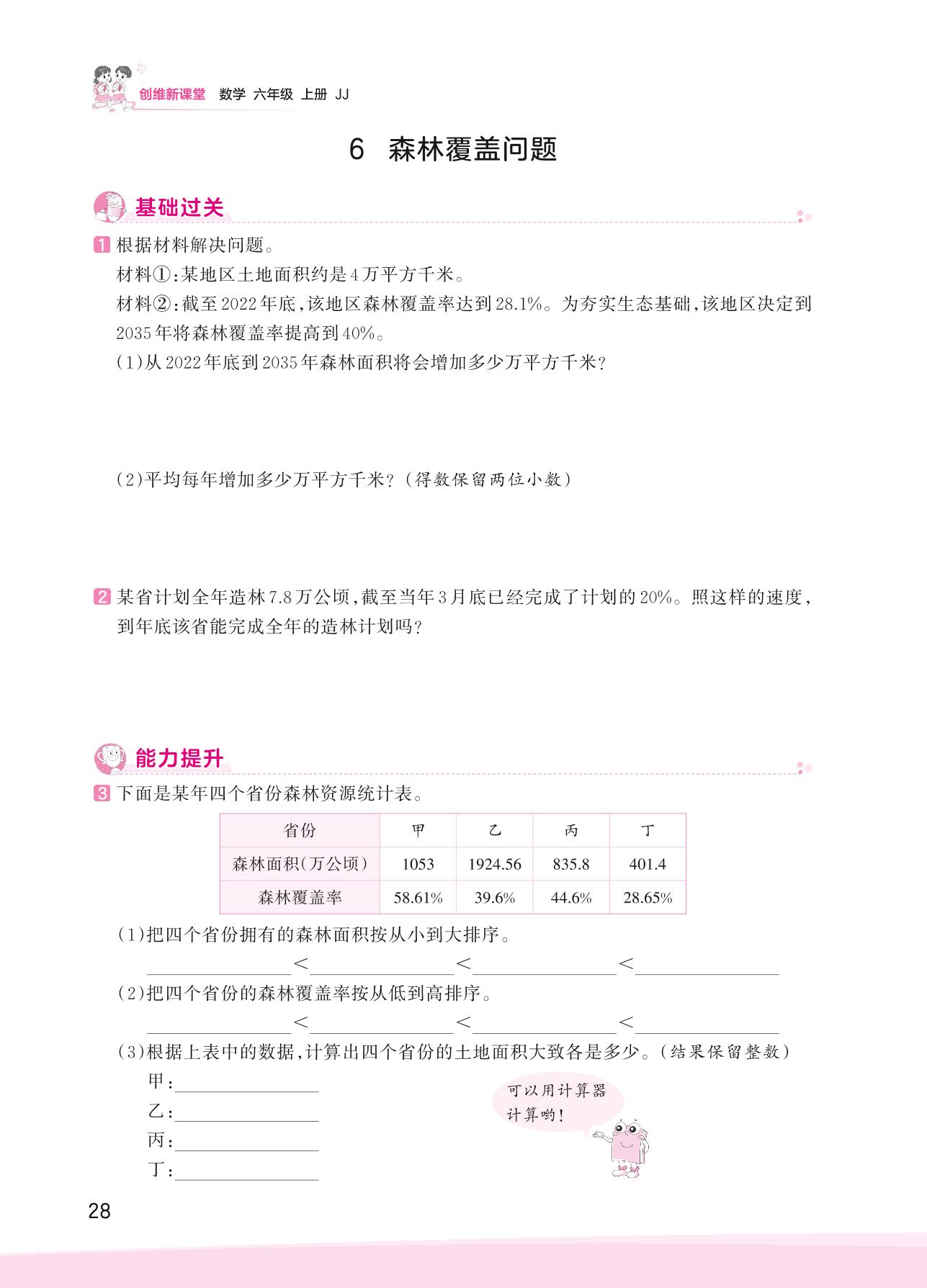 2023上册六年级数学冀教版 三 百分数——6 森林覆盖问题