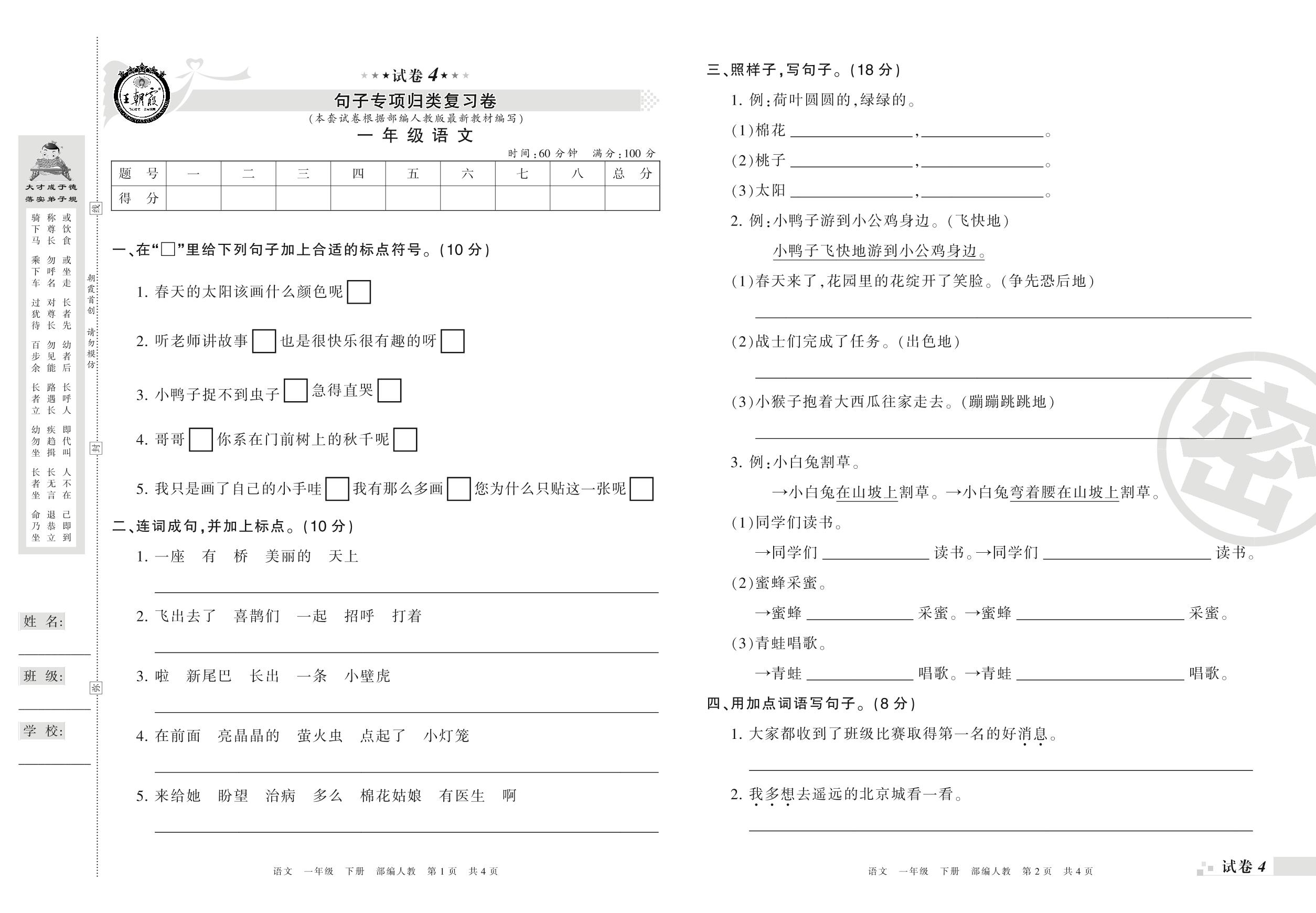 王朝霞期末专项卷——句子专项归类复习卷一年级下册语文(人教版)_R210731191104【4】
