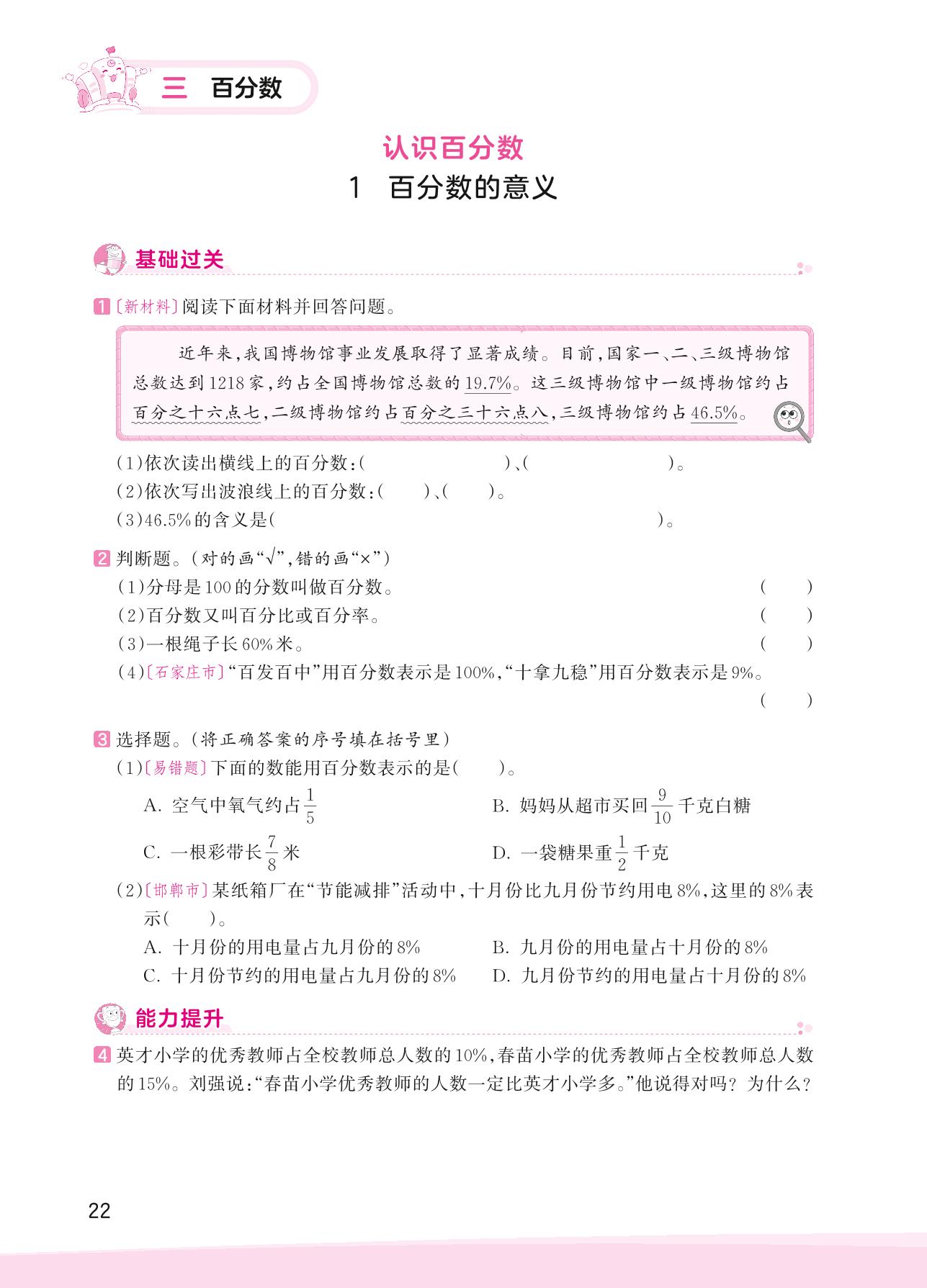 2023上册六年级数学冀教版 三 百分数——1 百分数的意义