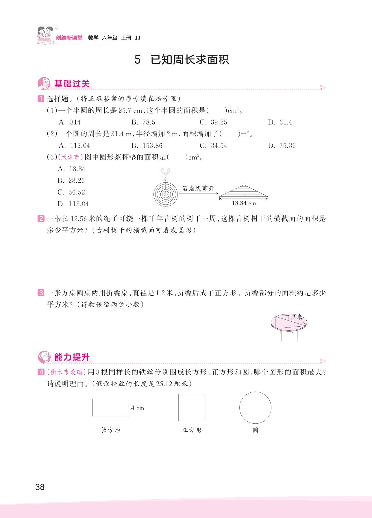 2023上册六年级数学冀教版 四 圆的周长和面积——5 已知周长求面积