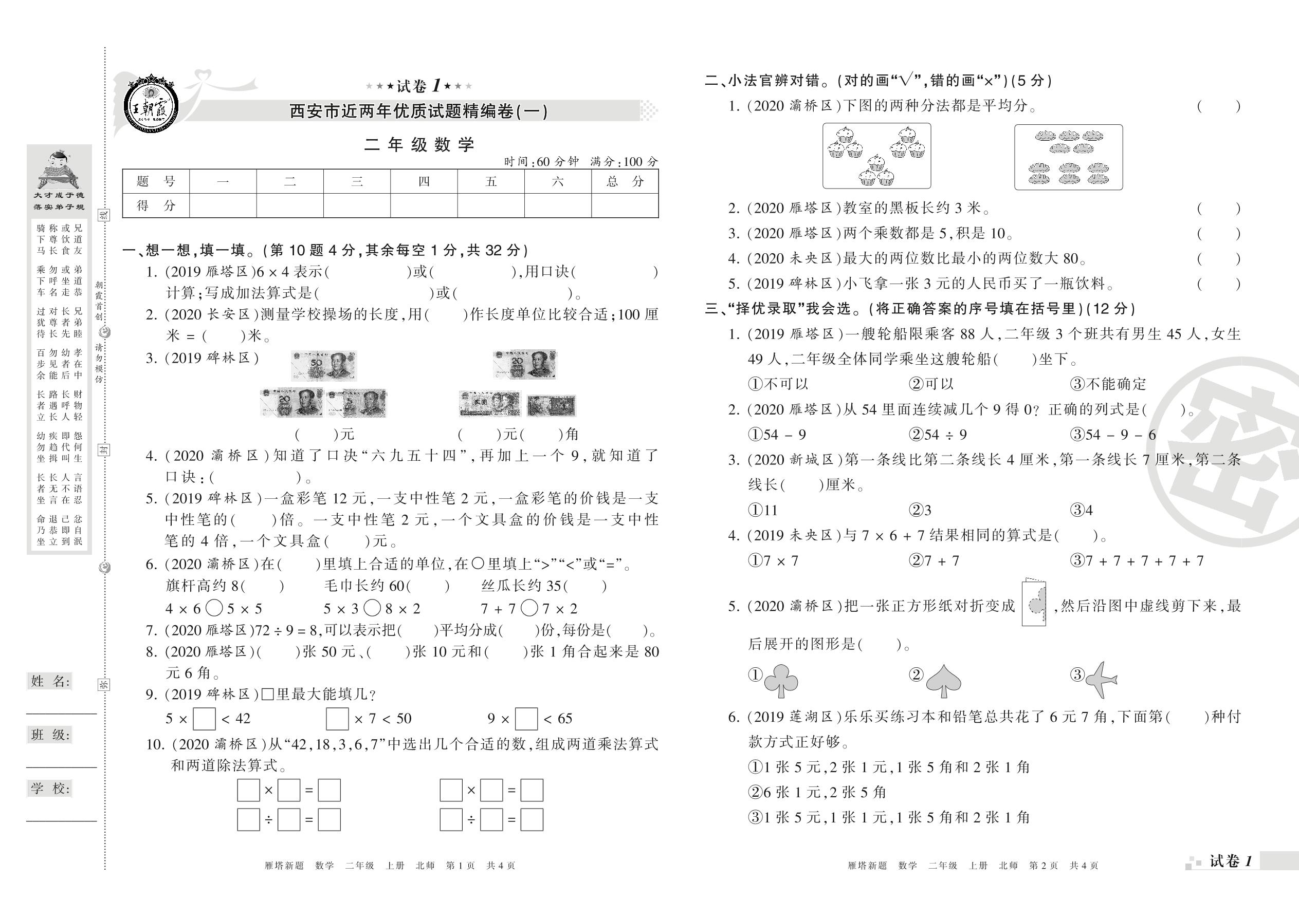 西安市近两年优质试题精编卷(一)二年级上册数学(北师版)【1】
