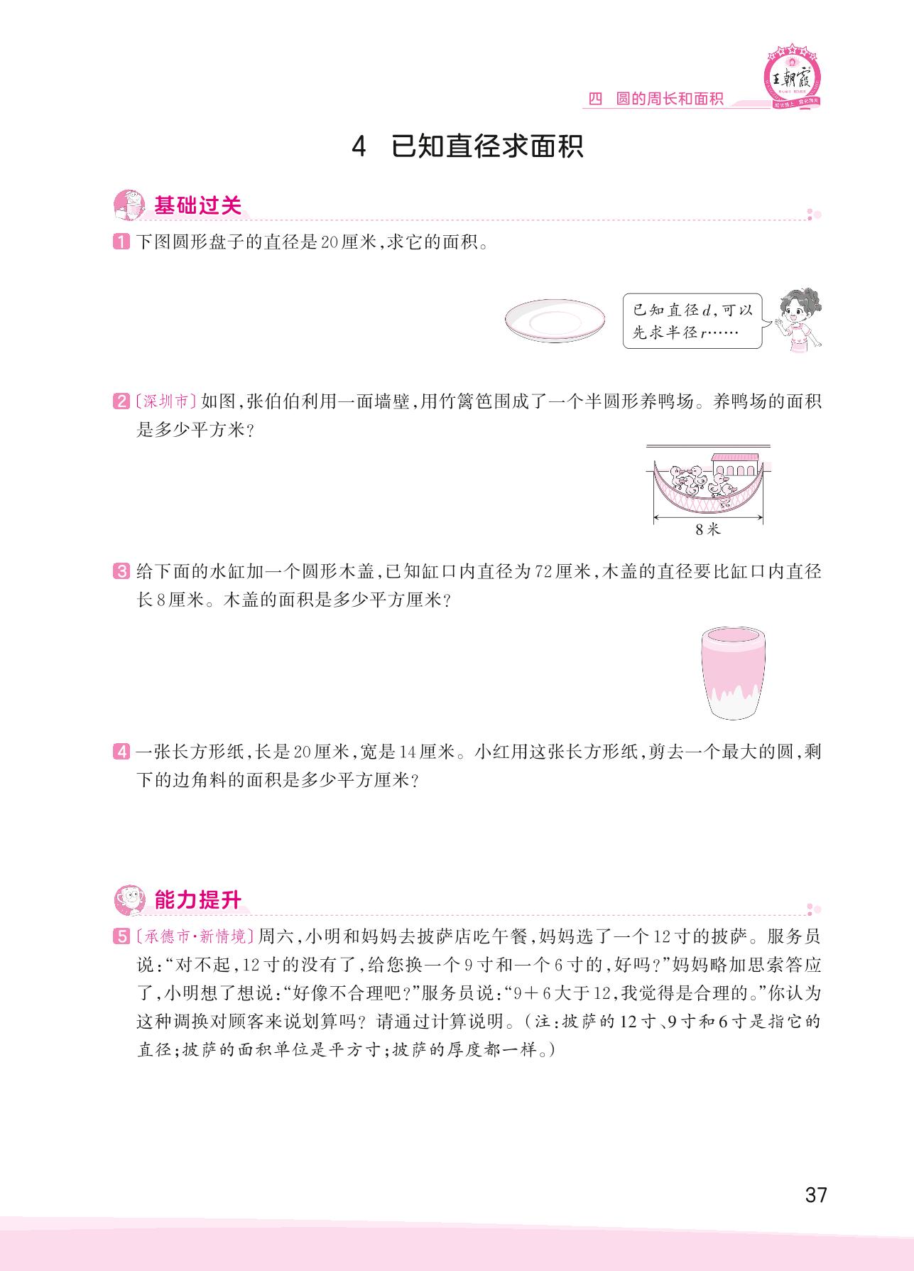 2023上册六年级数学冀教版 四 圆的周长和面积——4 已知直径求面积
