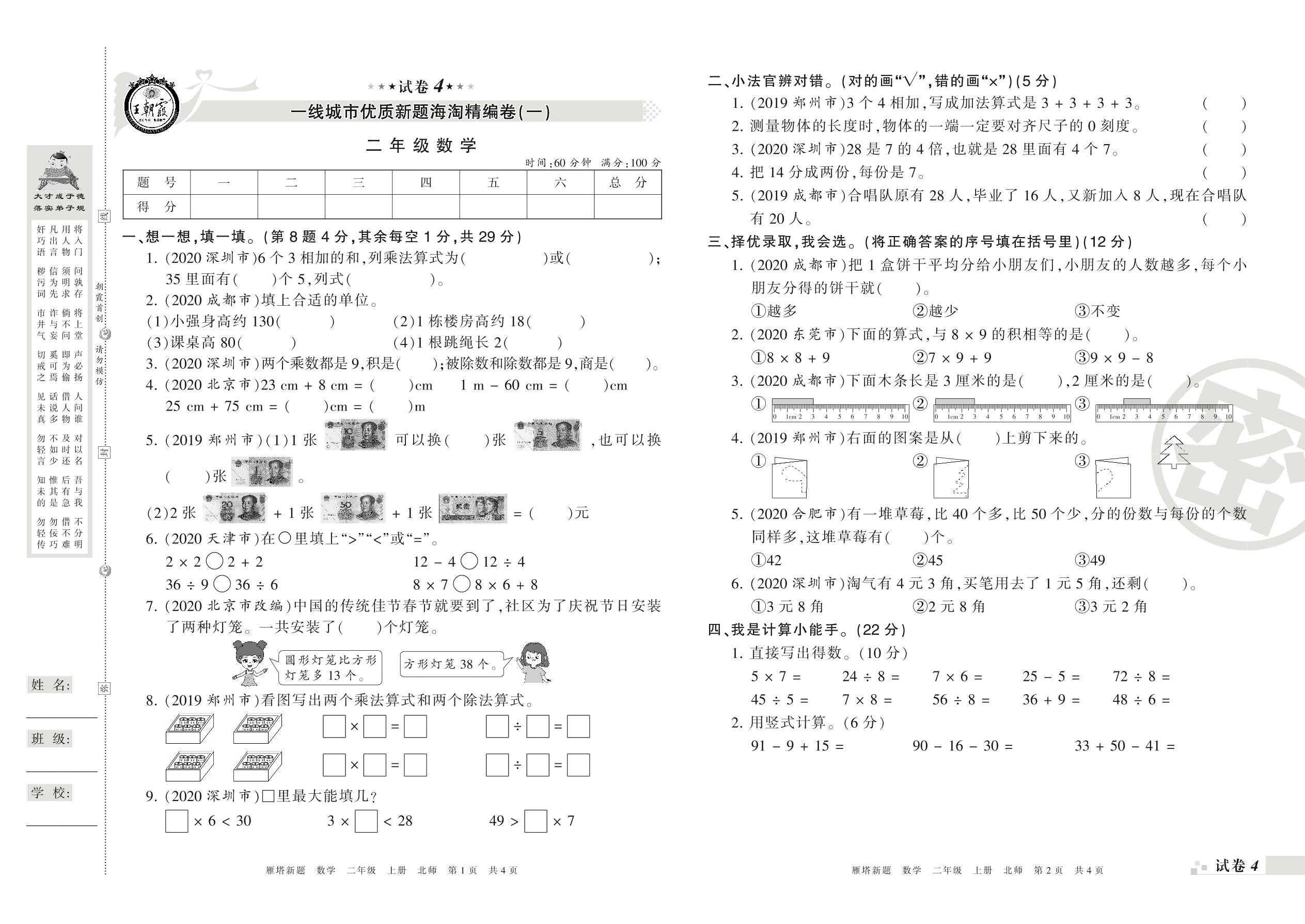 王朝霞海淘期末精编卷二年级上册数学(北师版)【4】