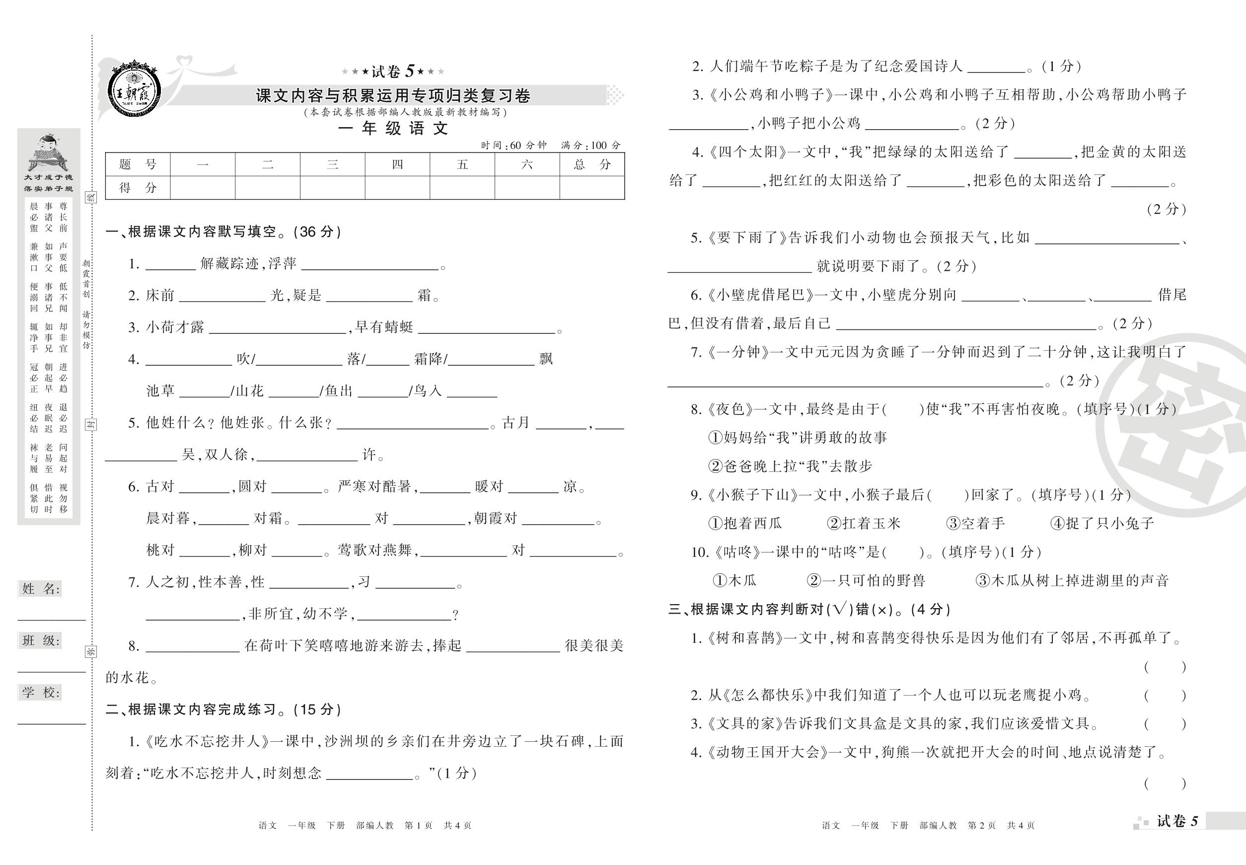 王朝霞期末专项卷——课文内容与积累运用专项归类复习卷一年级下册语文(人教版)_R210731191109【5】