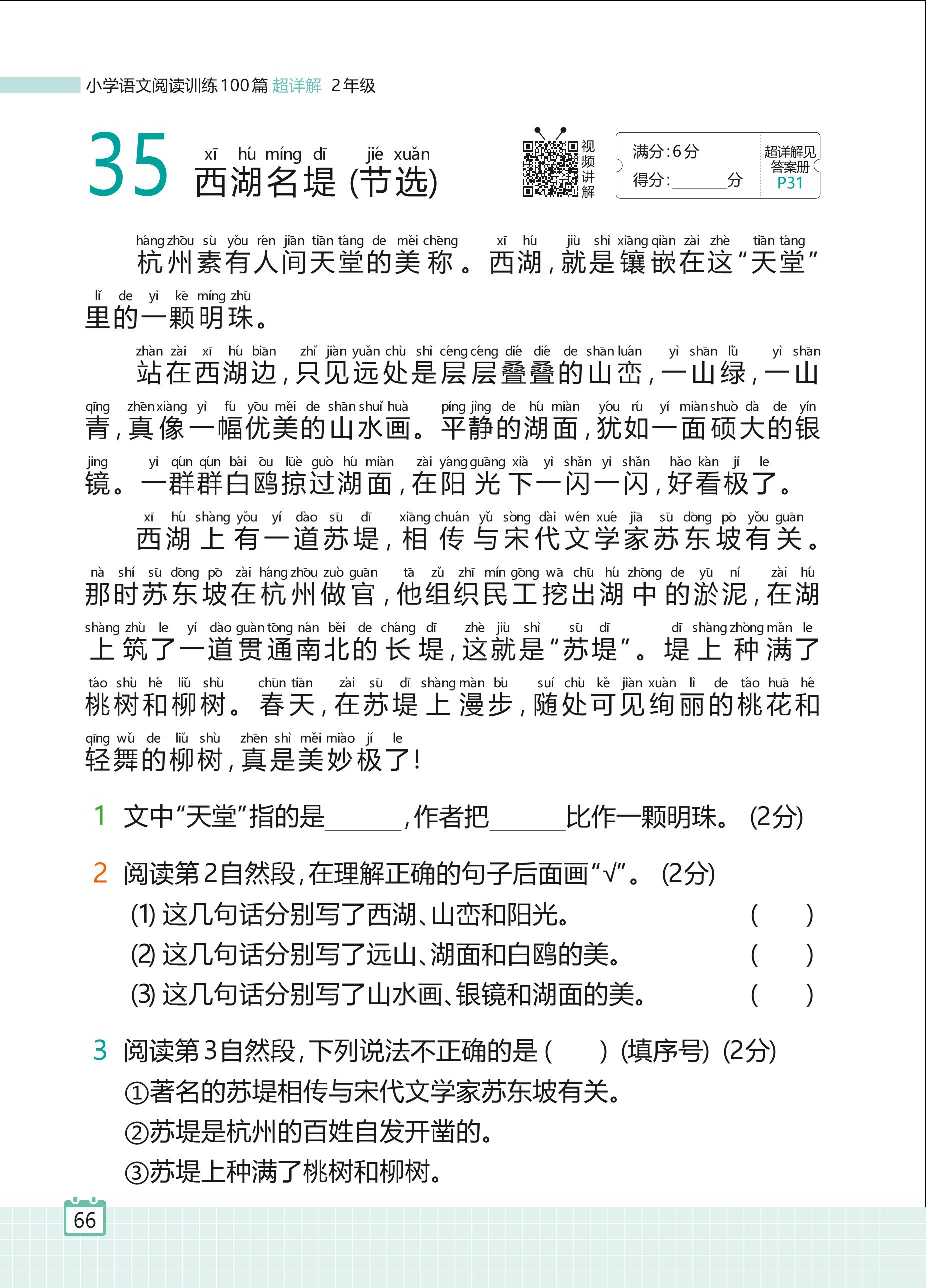 2024全一册二年级语文人教版 专题三 写景状物 35 西湖名堤(节选)