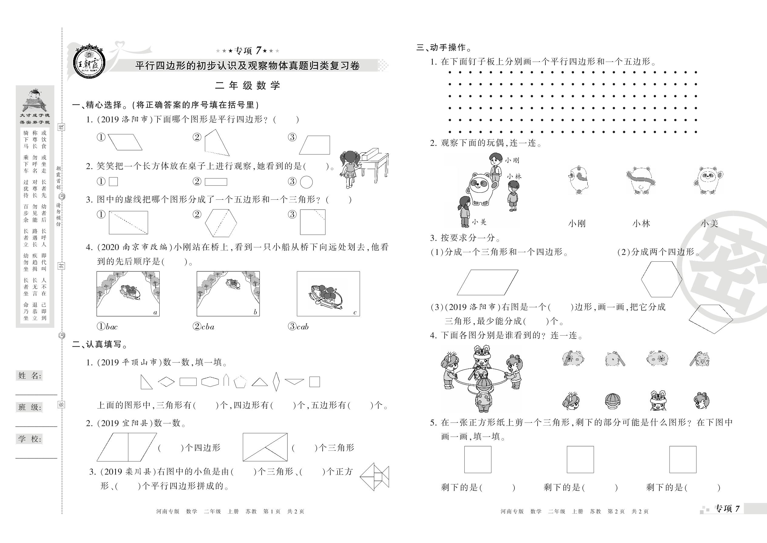 王朝霞期末专项卷——平行四边形的初步认识及观察物体真题归类复习、新颖题速递:生活与数学二年级上册数学(苏教版)【0】