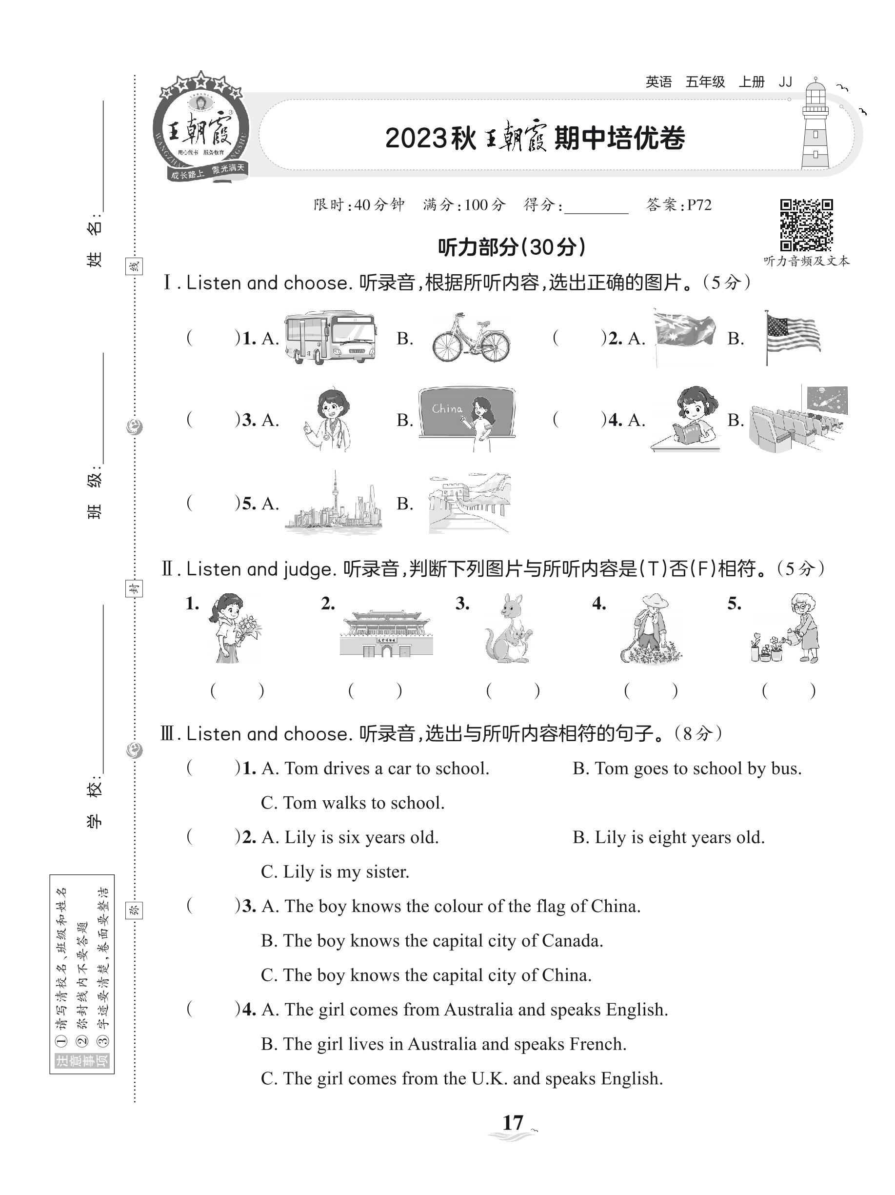 2023上册五年级英语冀教版 2023秋王朝霞期中培优卷