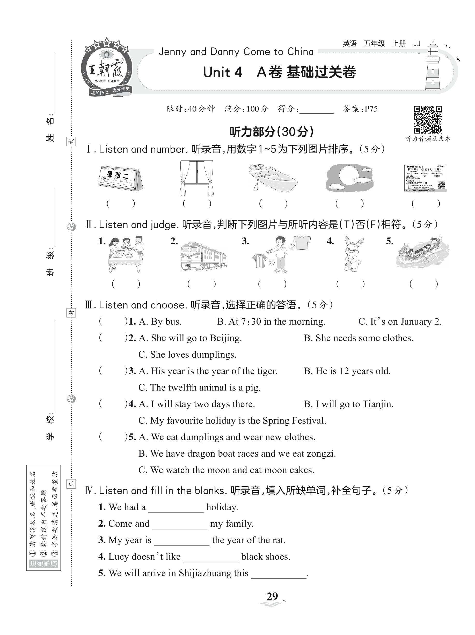 2023上册五年级英语冀教版 Unit 4 A卷 基础过关卷