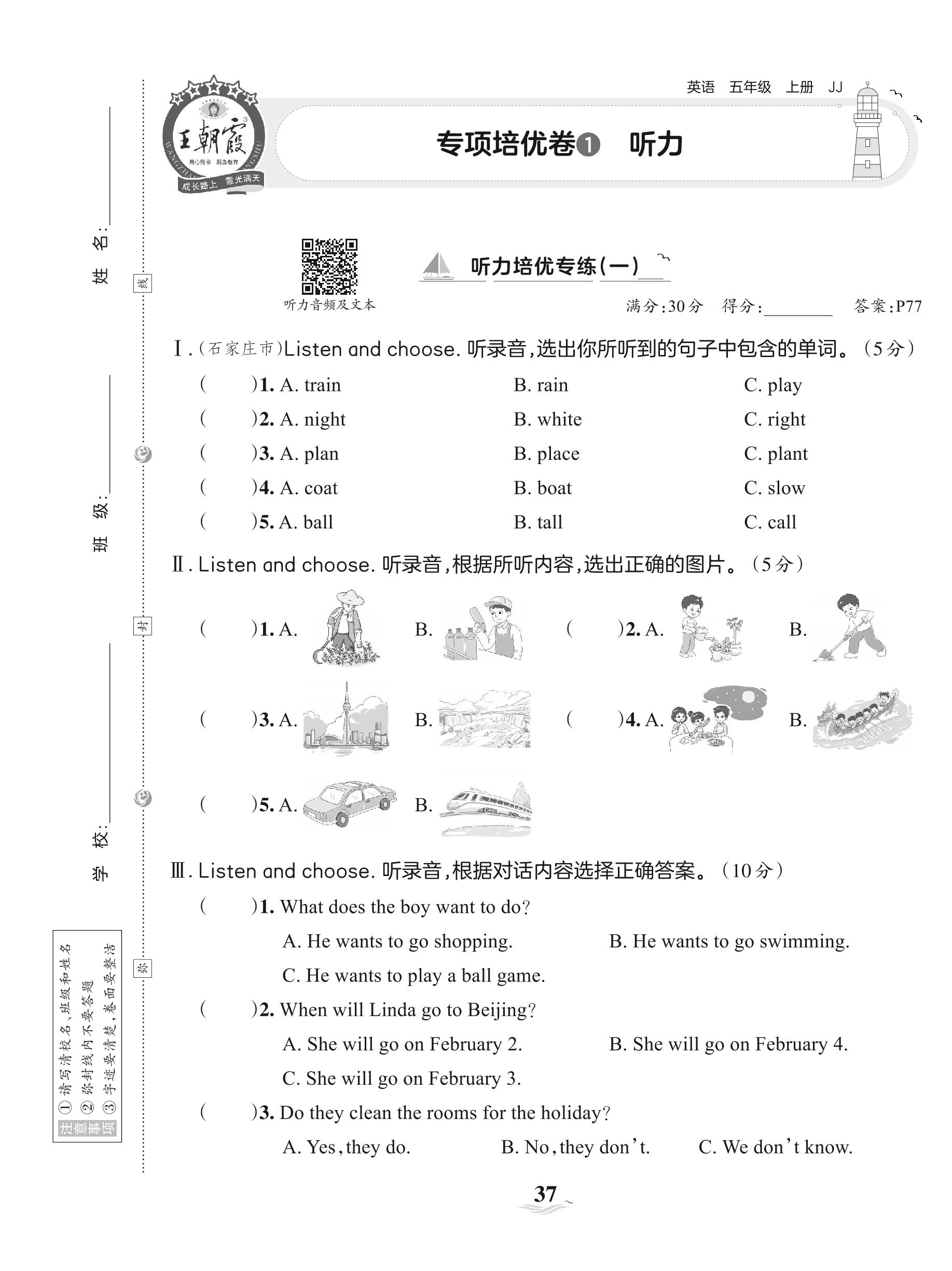 2023上册五年级英语冀教版 专项培优卷 1 听力