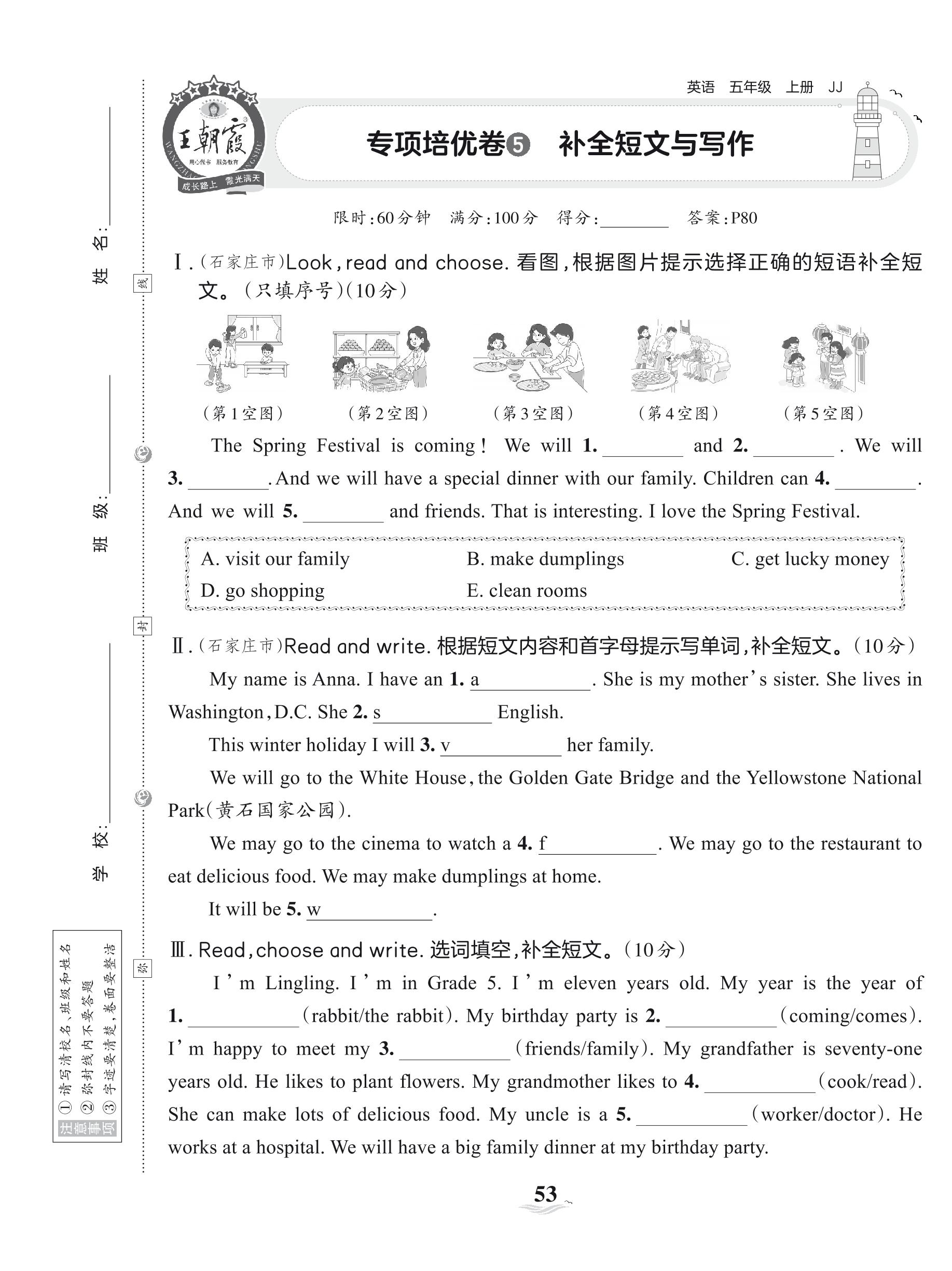 2023上册五年级英语冀教版 专项培优卷 5 补全短文与写作
