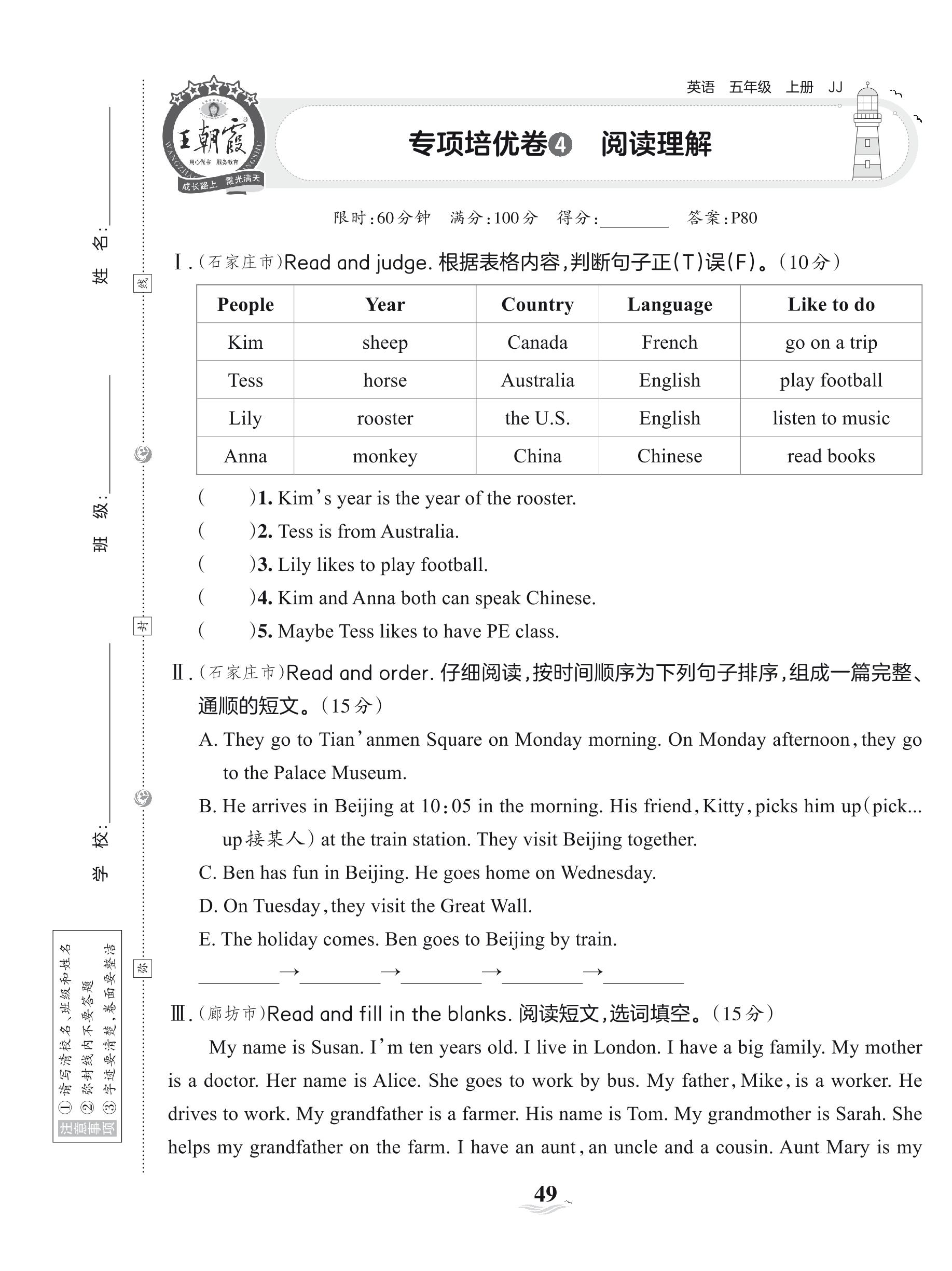 2023上册五年级英语冀教版 专项培优卷 4 阅读理解