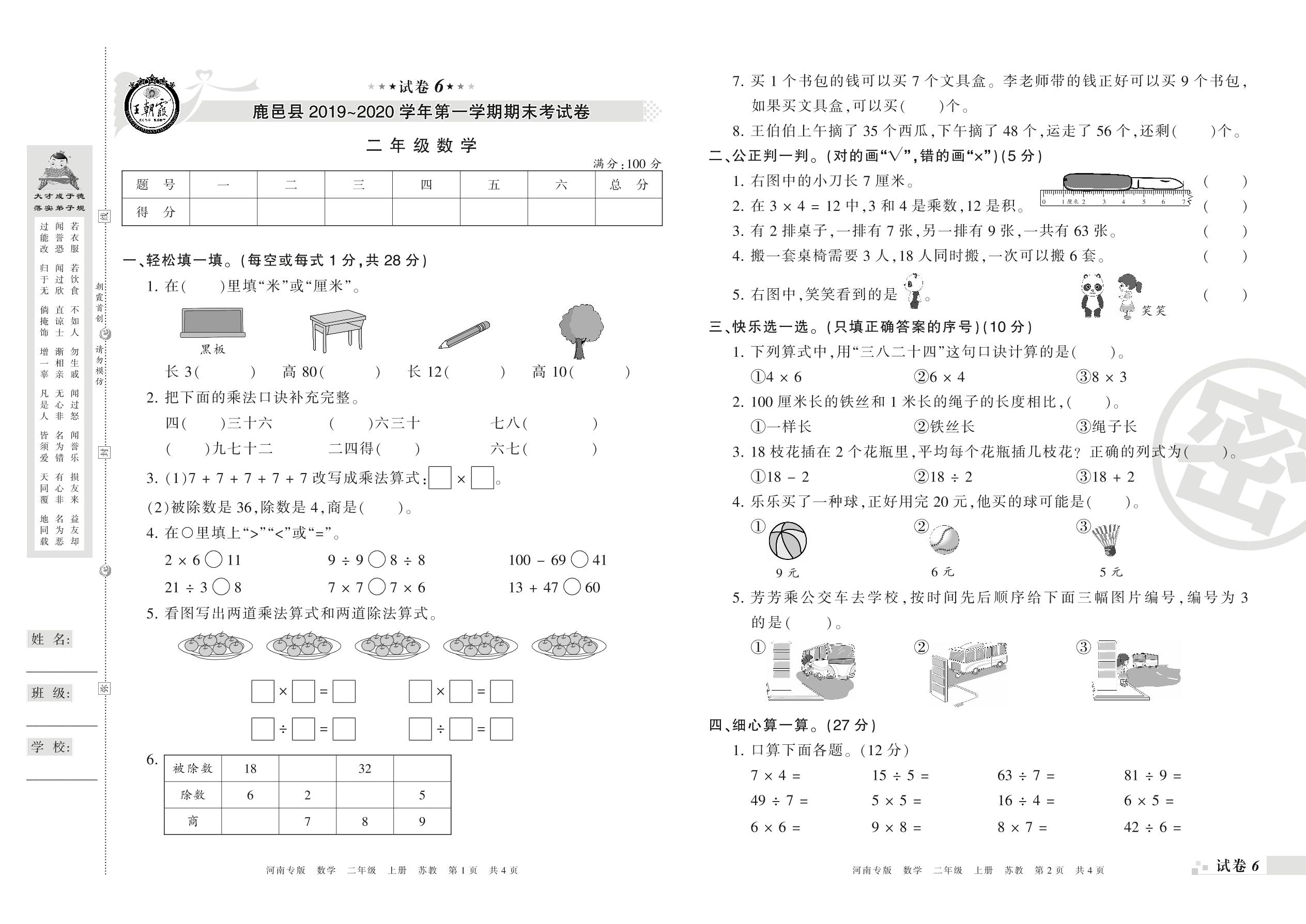 2019-2020学年第一学期周口市鹿邑县二年级数学试卷(苏教版)【6】